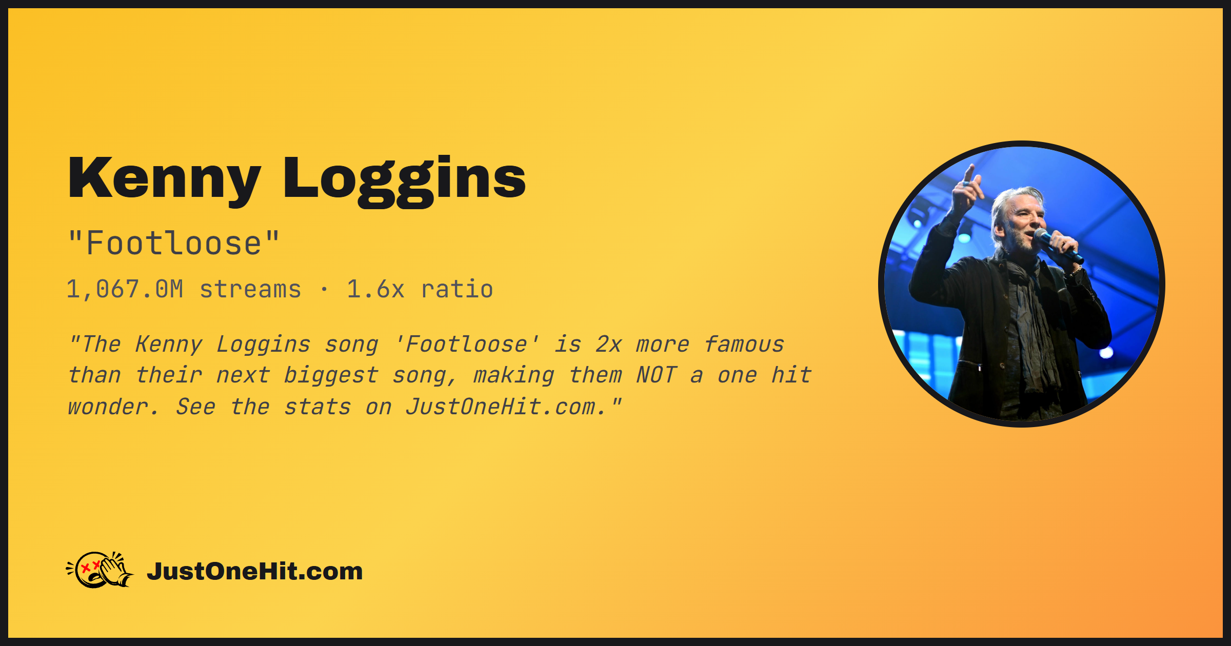"The Kenny Loggins song 'Footloose' is 2x more famous than their next biggest song, making them NOT a one hit wonder. See the stats on JustOneHit.com."