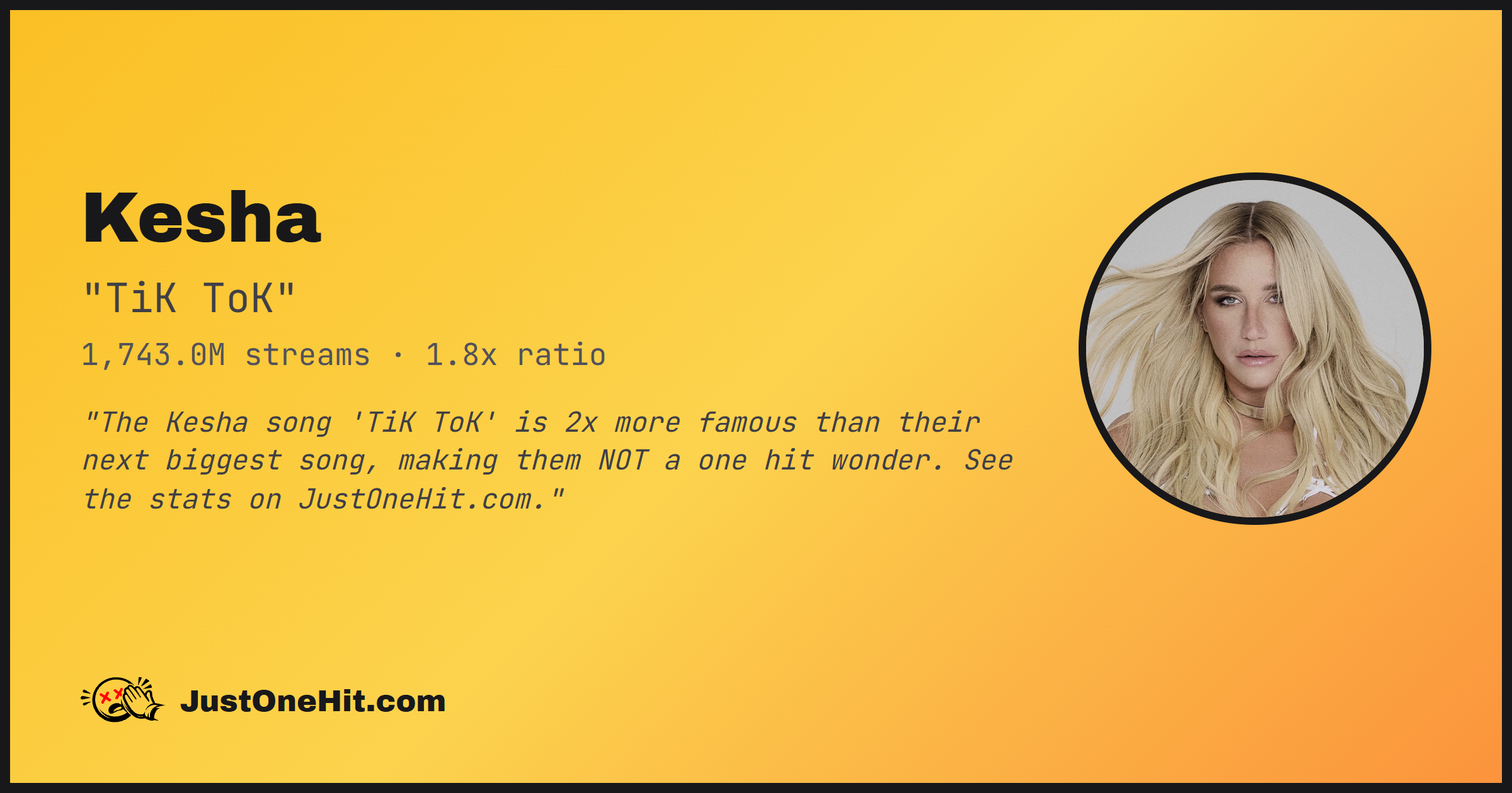 "The Kesha song 'TiK ToK' is 2x more famous than their next biggest song, making them NOT a one hit wonder. See the stats on JustOneHit.com."