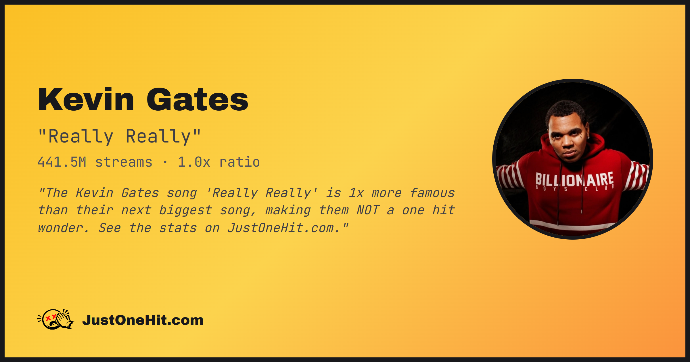 "The Kevin Gates song 'Really Really' is 1x more famous than their next biggest song, making them NOT a one hit wonder. See the stats on JustOneHit.com."