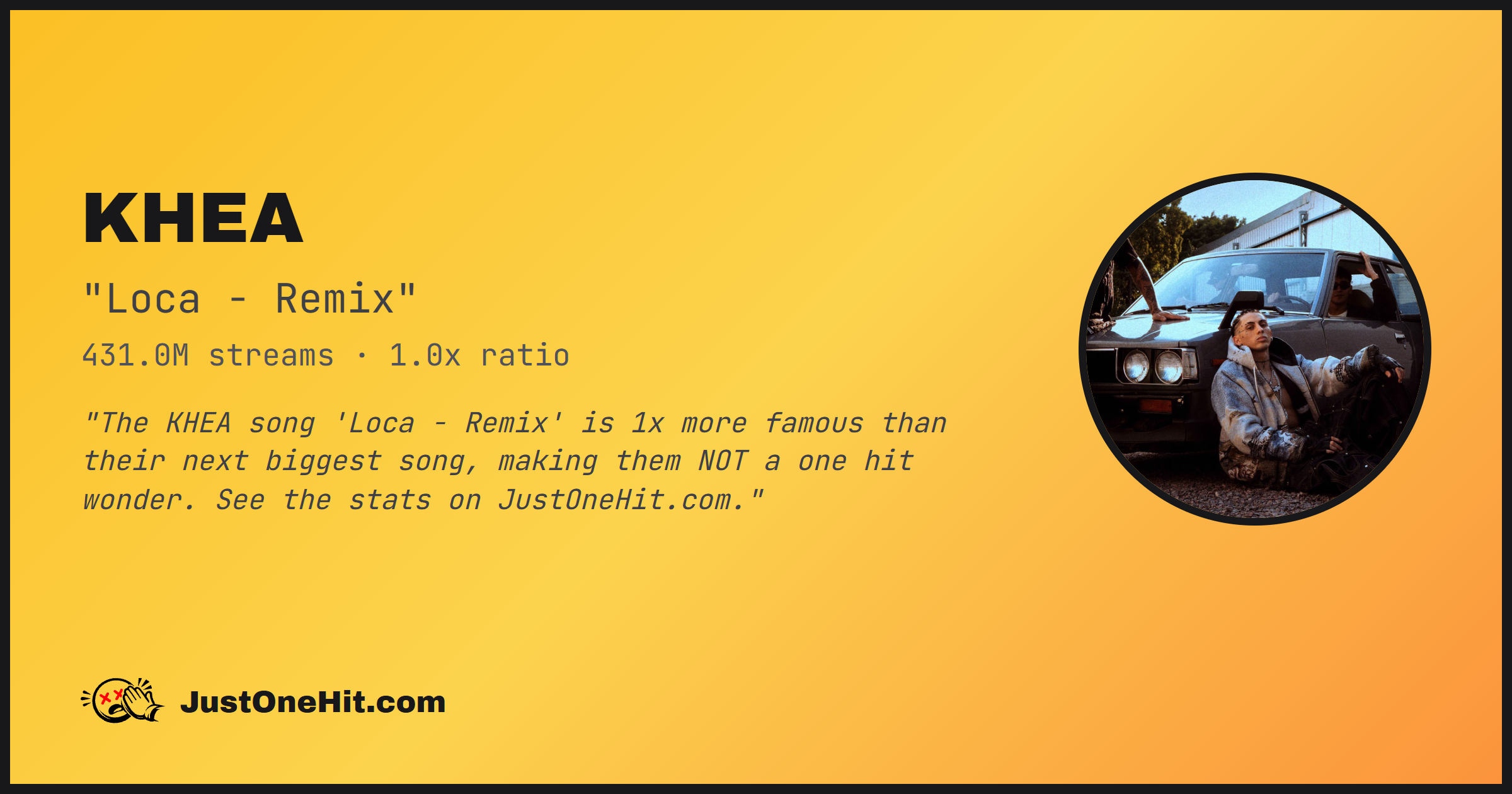 "The KHEA song 'Loca' is 1x more famous than their next biggest song, making them NOT a one hit wonder. See the stats on JustOneHit.com."