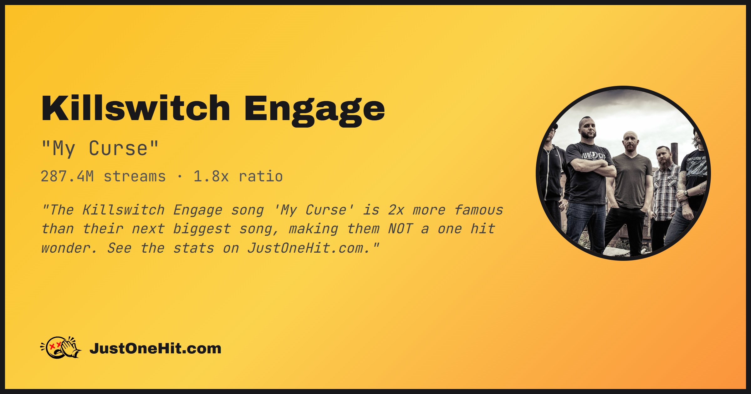 "The Killswitch Engage song 'My Curse' is 2x more famous than their next biggest song, making them NOT a one hit wonder. See the stats on JustOneHit.com."