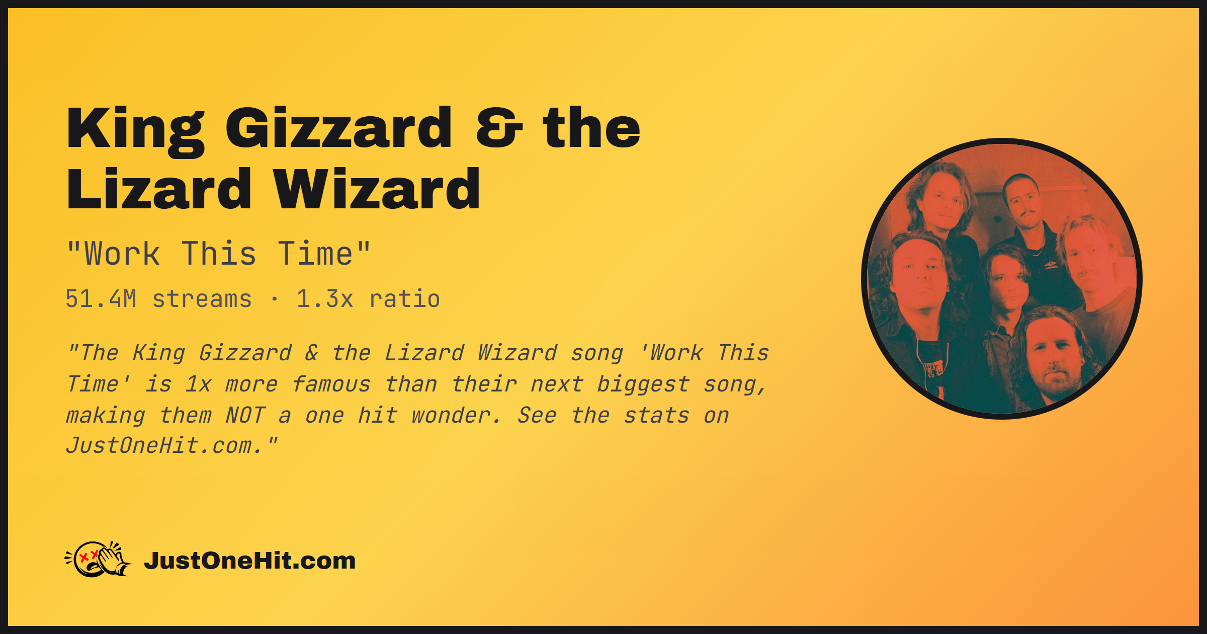 "The King Gizzard & the Lizard Wizard song 'Work This Time' is 1x more famous than their next biggest song, making them NOT a one hit wonder. See the stats on JustOneHit.com."