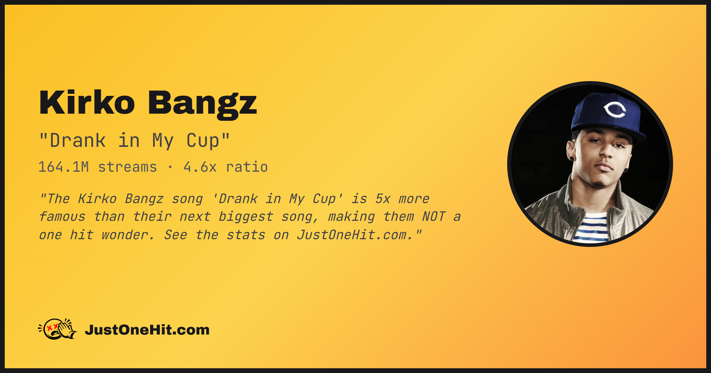 "The Kirko Bangz song 'Drank in My Cup' is 5x more famous than their next biggest song, making them NOT a one hit wonder. See the stats on JustOneHit.com."