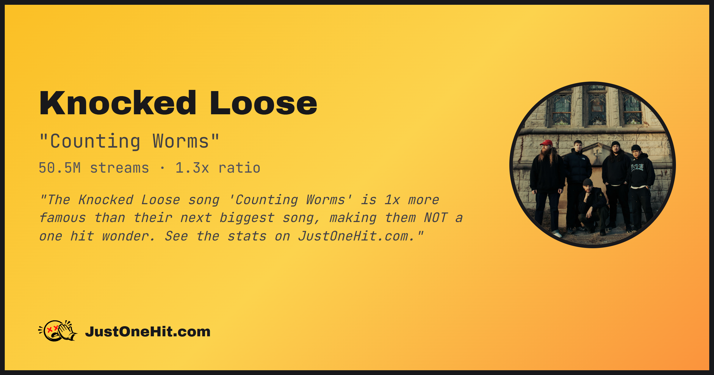 "The Knocked Loose song 'Counting Worms' is 1x more famous than their next biggest song, making them NOT a one hit wonder. See the stats on JustOneHit.com."