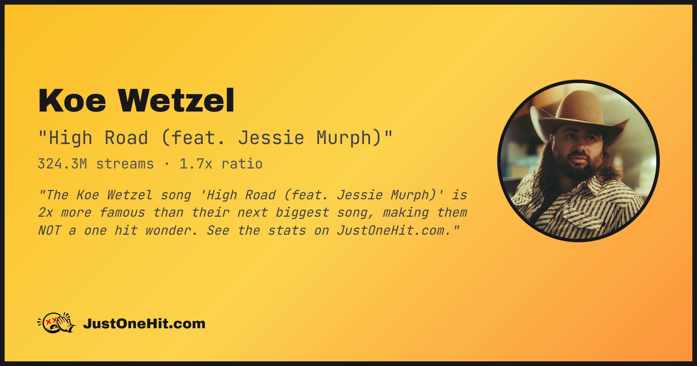 "The Koe Wetzel song 'High Road (feat. Jessie Murph)' is 2x more famous than their next biggest song, making them NOT a one hit wonder. See the stats on JustOneHit.com."