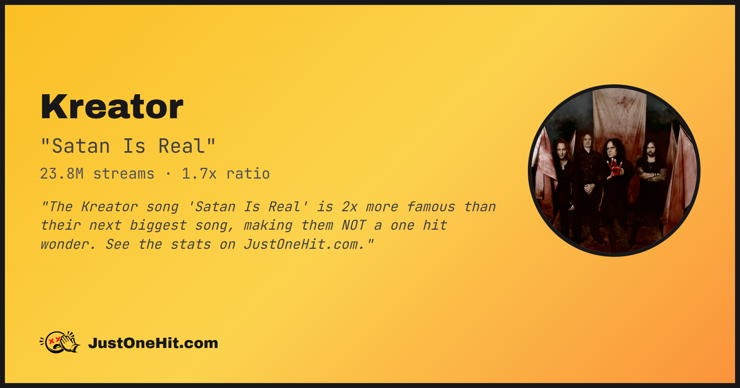 "The Kreator song 'Satan Is Real' is 2x more famous than their next biggest song, making them NOT a one hit wonder. See the stats on JustOneHit.com."