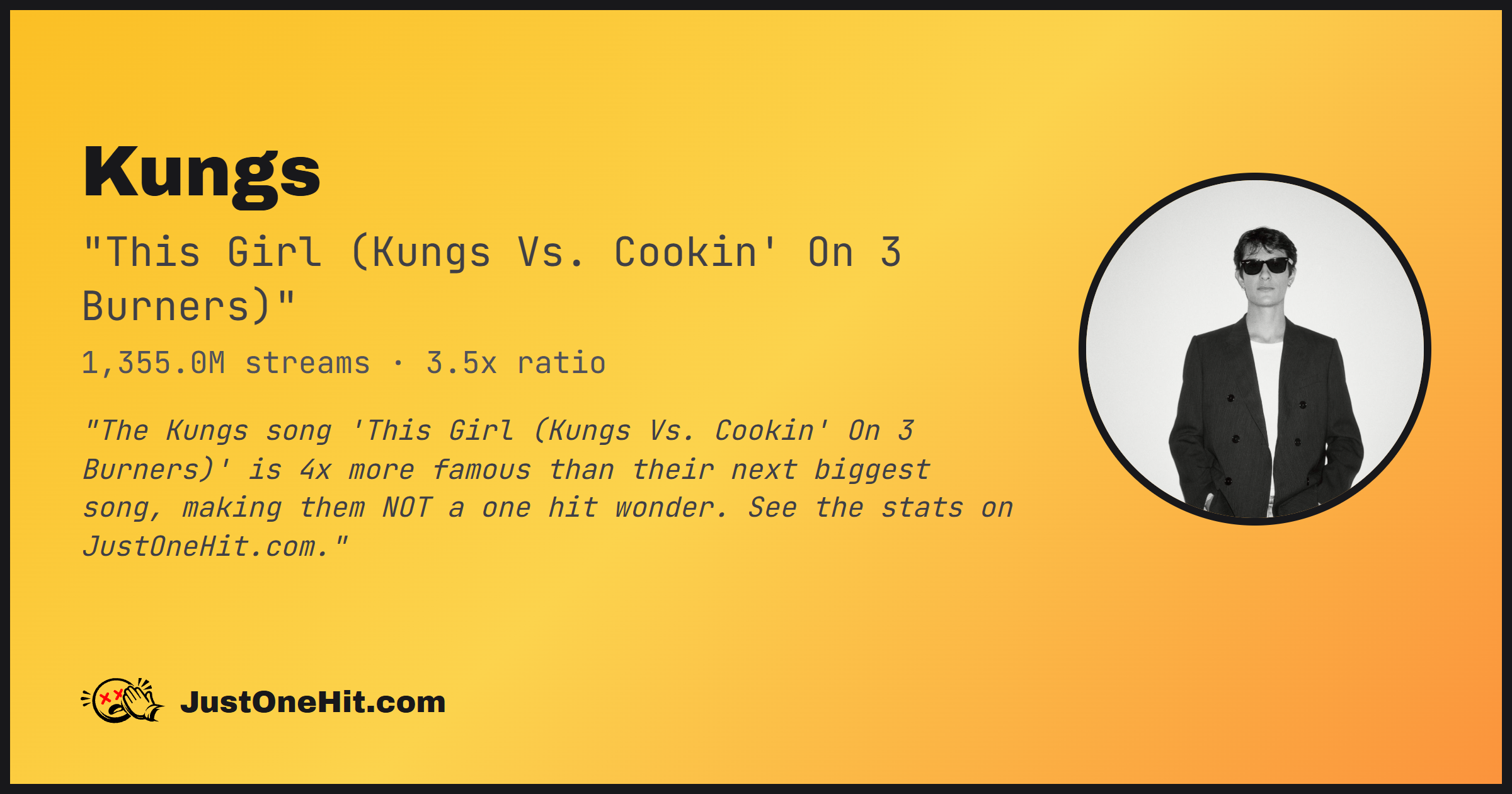 "The Kungs song 'This Girl (Kungs Vs. Cookin' On 3 Burners)' is 4x more famous than their next biggest song, making them NOT a one hit wonder. See the stats on JustOneHit.com."