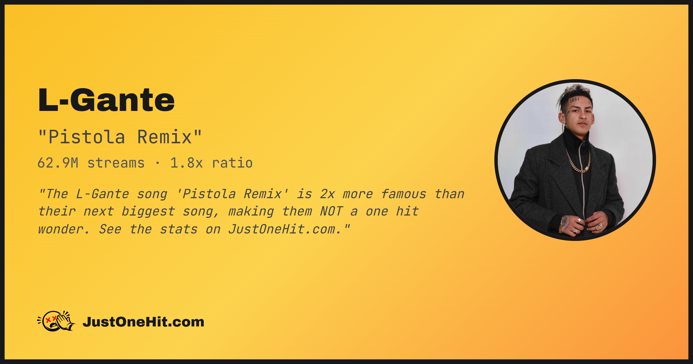 "The L-Gante song 'Pistola Remix' is 2x more famous than their next biggest song, making them NOT a one hit wonder. See the stats on JustOneHit.com."