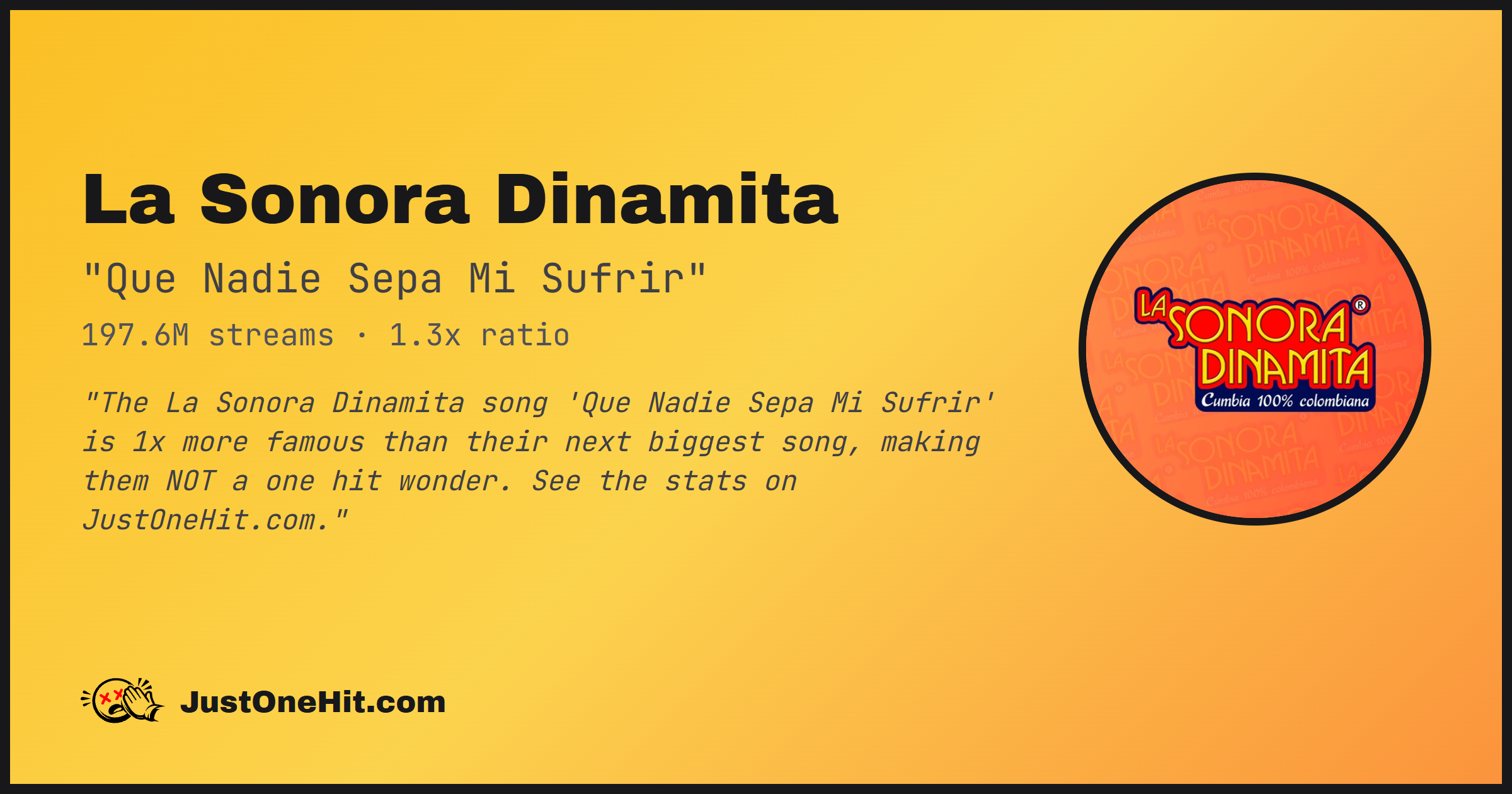 "The La Sonora Dinamita song 'Que Nadie Sepa Mi Sufrir' is 1x more famous than their next biggest song, making them NOT a one hit wonder. See the stats on JustOneHit.com."