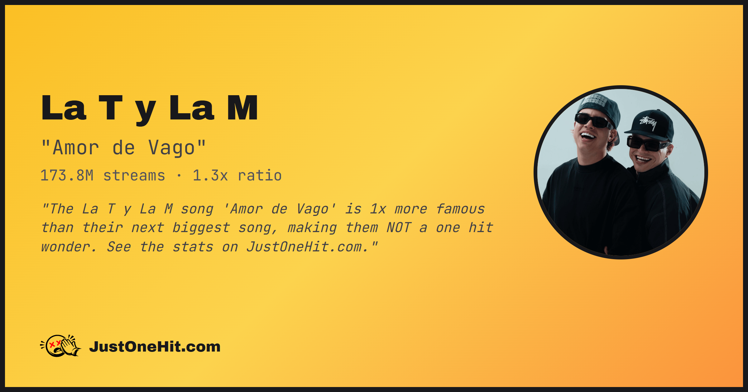 "The La T y La M song 'Amor de Vago' is 1x more famous than their next biggest song, making them NOT a one hit wonder. See the stats on JustOneHit.com."