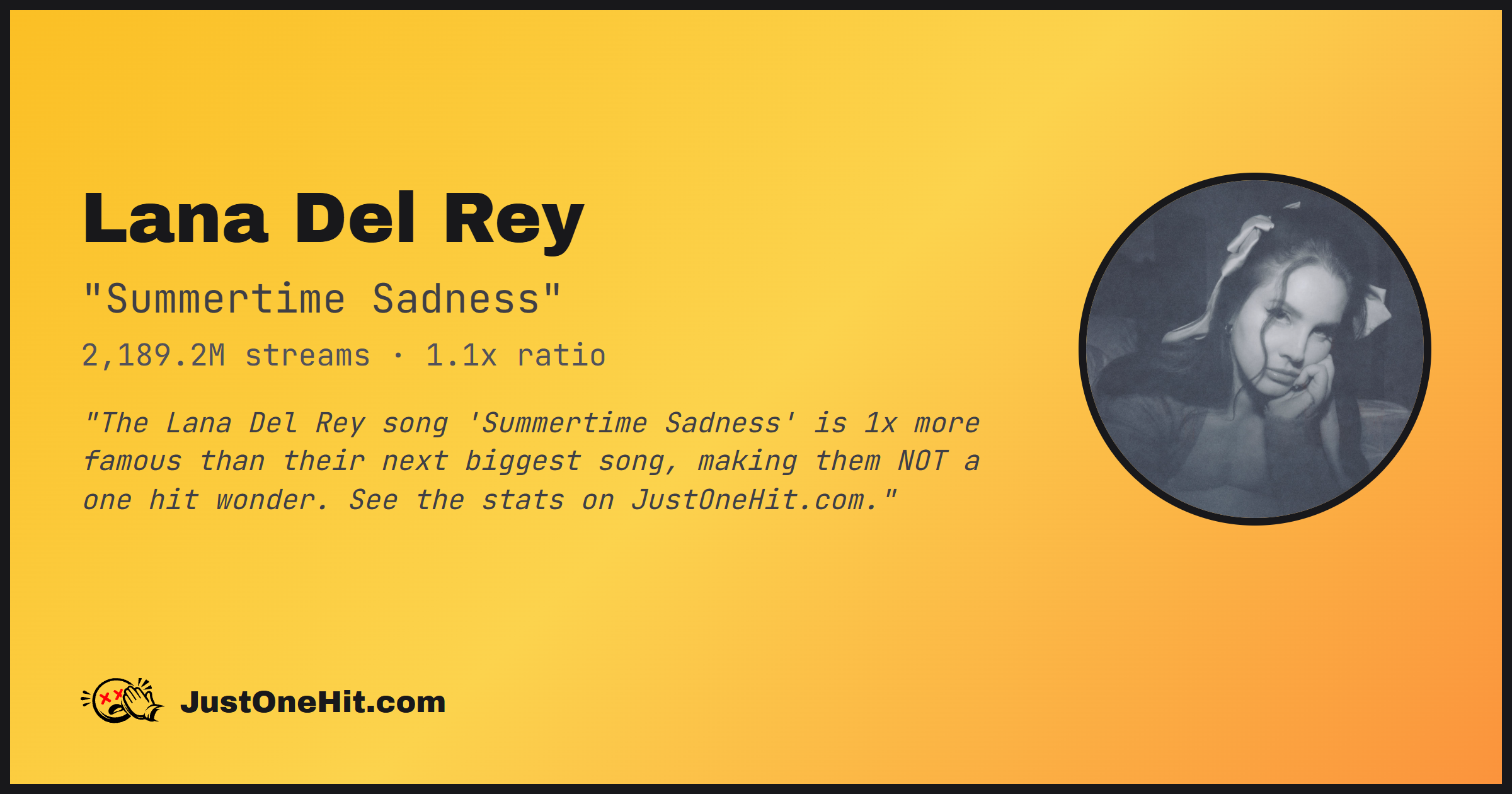 "The Lana Del Rey song 'Summertime Sadness' is 1x more famous than their next biggest song, making them NOT a one hit wonder. See the stats on JustOneHit.com."