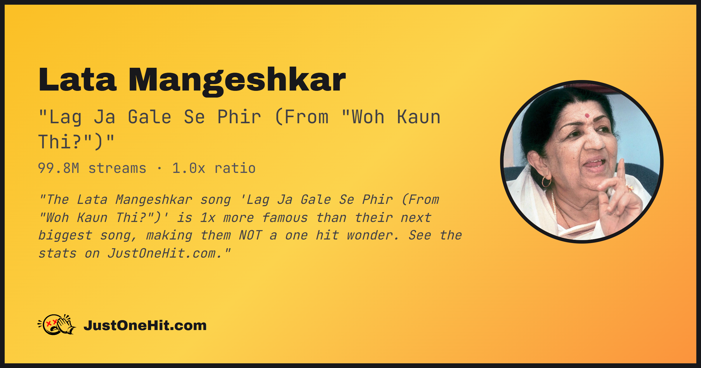 "The Lata Mangeshkar song 'Lag Ja Gale Se Phir (From "Woh Kaun Thi?")' is 1x more famous than their next biggest song, making them NOT a one hit wonder. See the stats on JustOneHit.com."