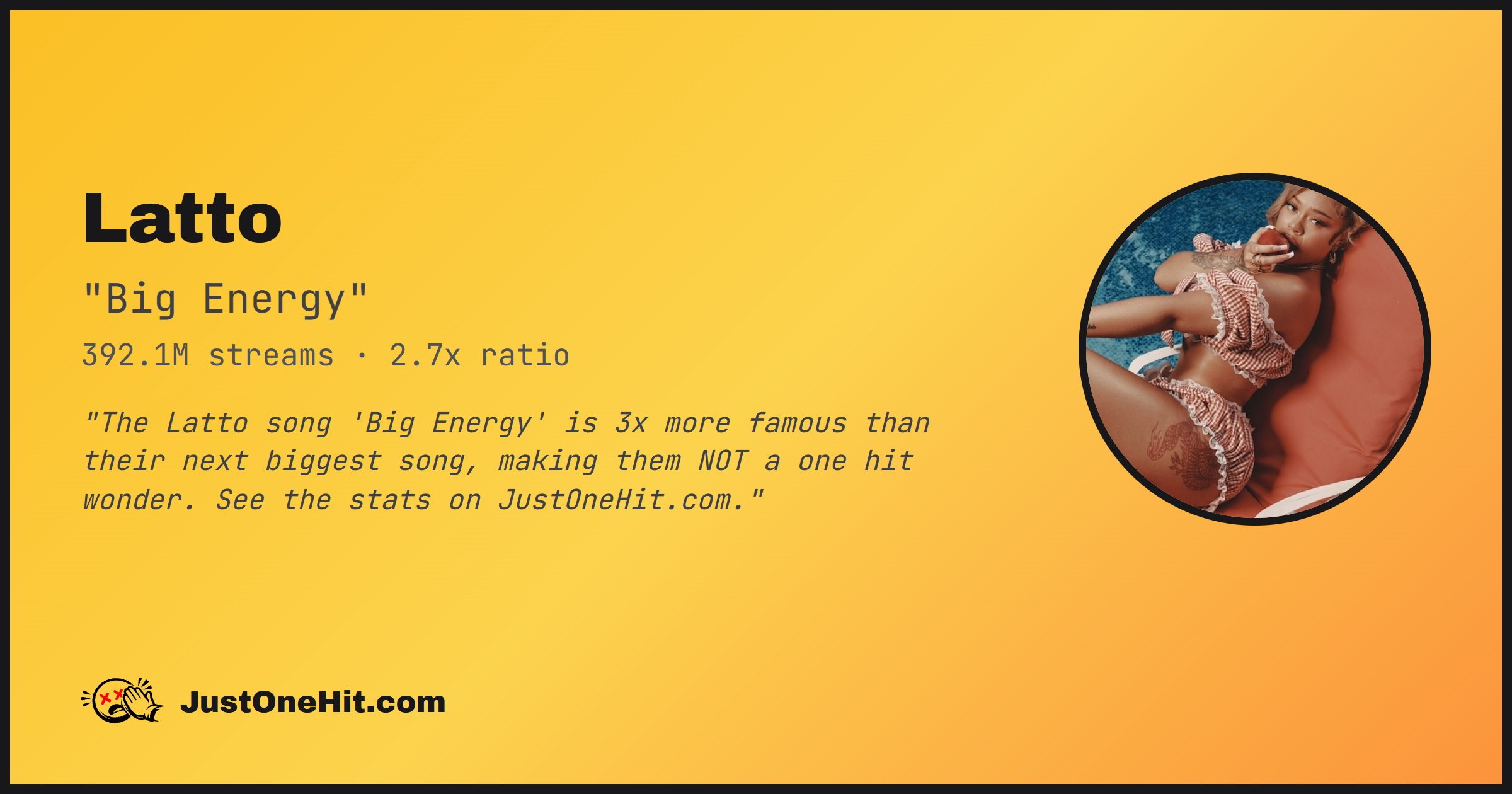 "The Latto song 'Big Energy' is 3x more famous than their next biggest song, making them NOT a one hit wonder. See the stats on JustOneHit.com."