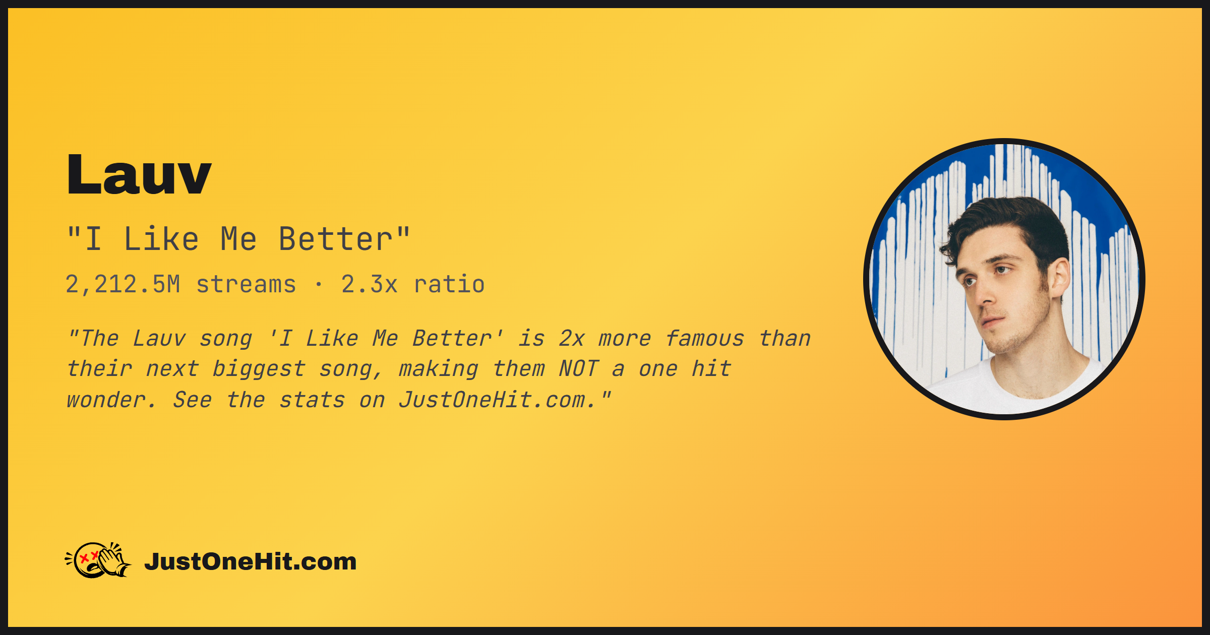 "The Lauv song 'I Like Me Better' is 2x more famous than their next biggest song, making them NOT a one hit wonder. See the stats on JustOneHit.com."