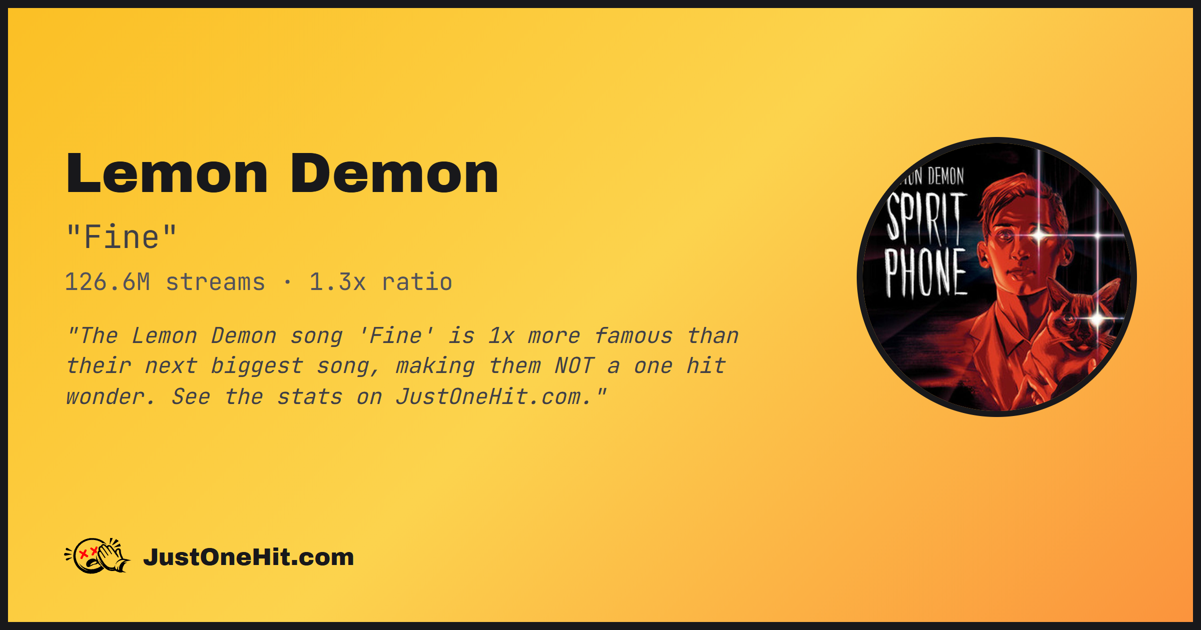 "The Lemon Demon song 'Fine' is 1x more famous than their next biggest song, making them NOT a one hit wonder. See the stats on JustOneHit.com."
