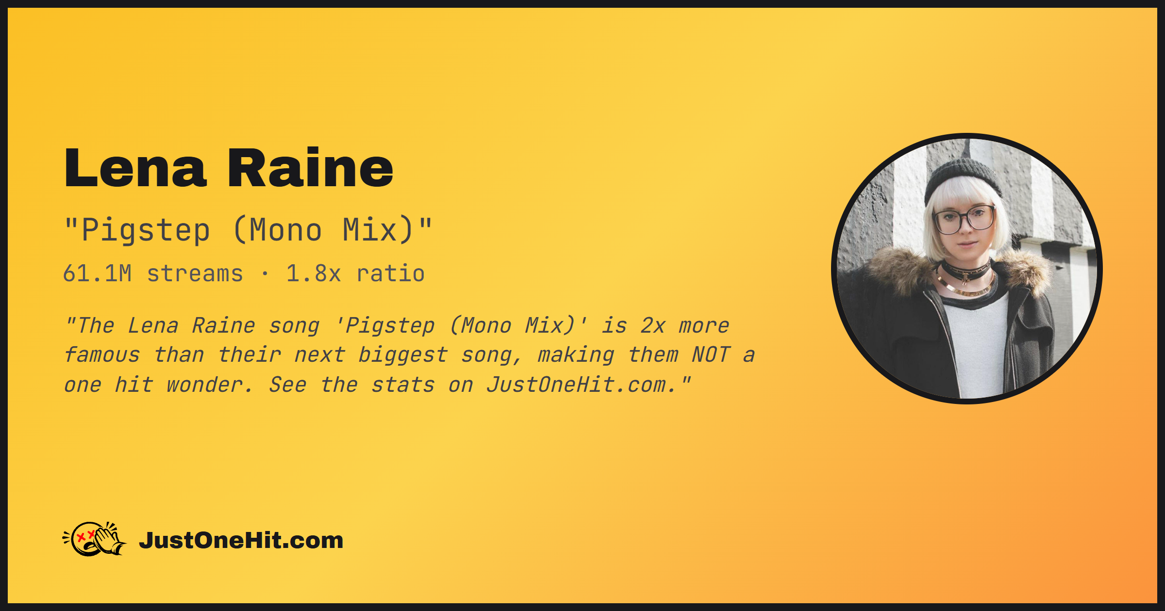 "The Lena Raine song 'Pigstep (Mono Mix)' is 2x more famous than their next biggest song, making them NOT a one hit wonder. See the stats on JustOneHit.com."
