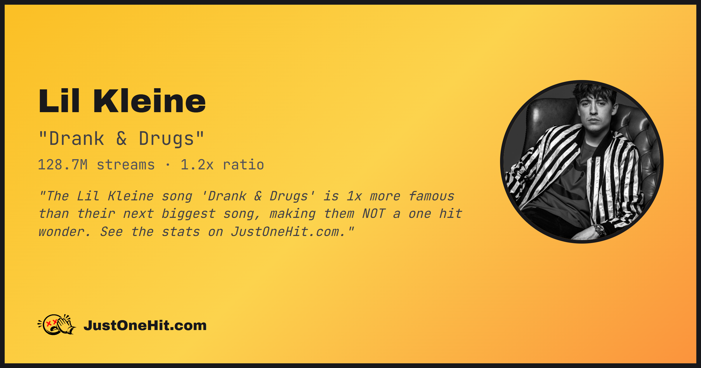 "The Lil Kleine song 'Drank & Drugs' is 1x more famous than their next biggest song, making them NOT a one hit wonder. See the stats on JustOneHit.com."