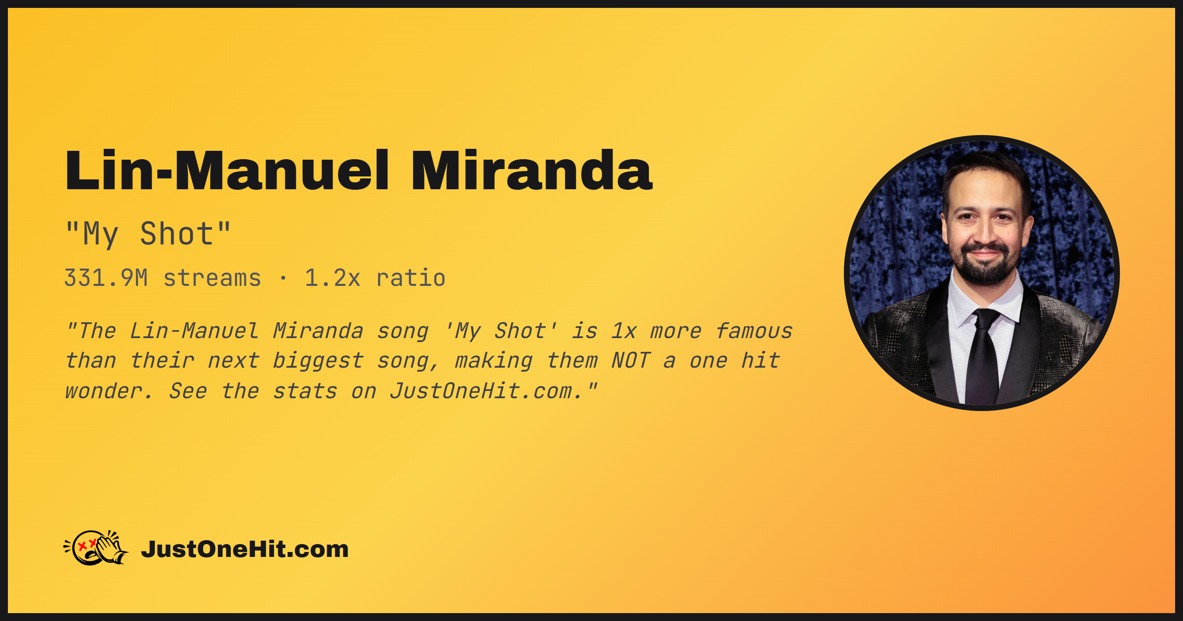 "The Lin-Manuel Miranda song 'My Shot' is 1x more famous than their next biggest song, making them NOT a one hit wonder. See the stats on JustOneHit.com."