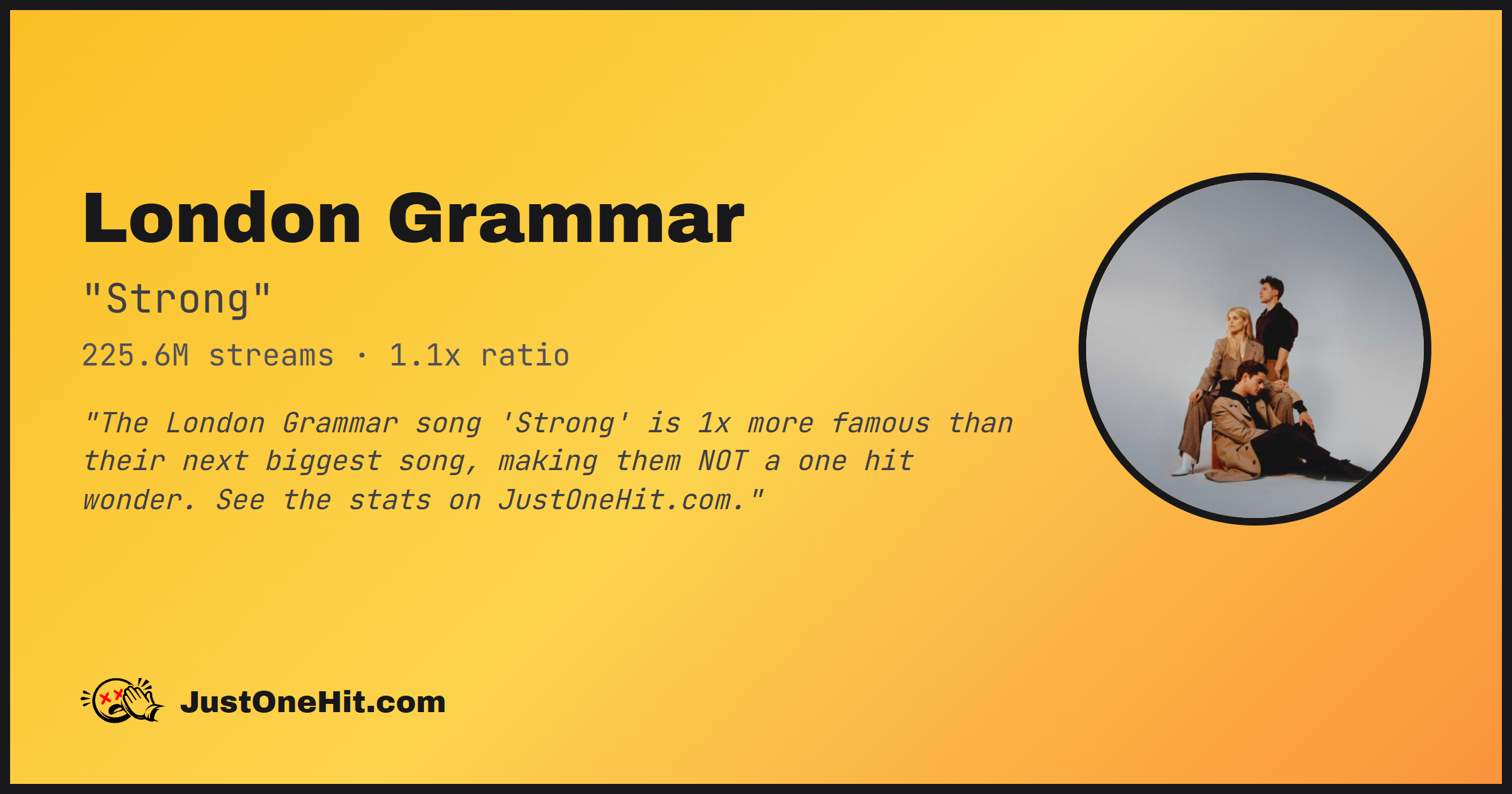 "The London Grammar song 'Strong' is 1x more famous than their next biggest song, making them NOT a one hit wonder. See the stats on JustOneHit.com."