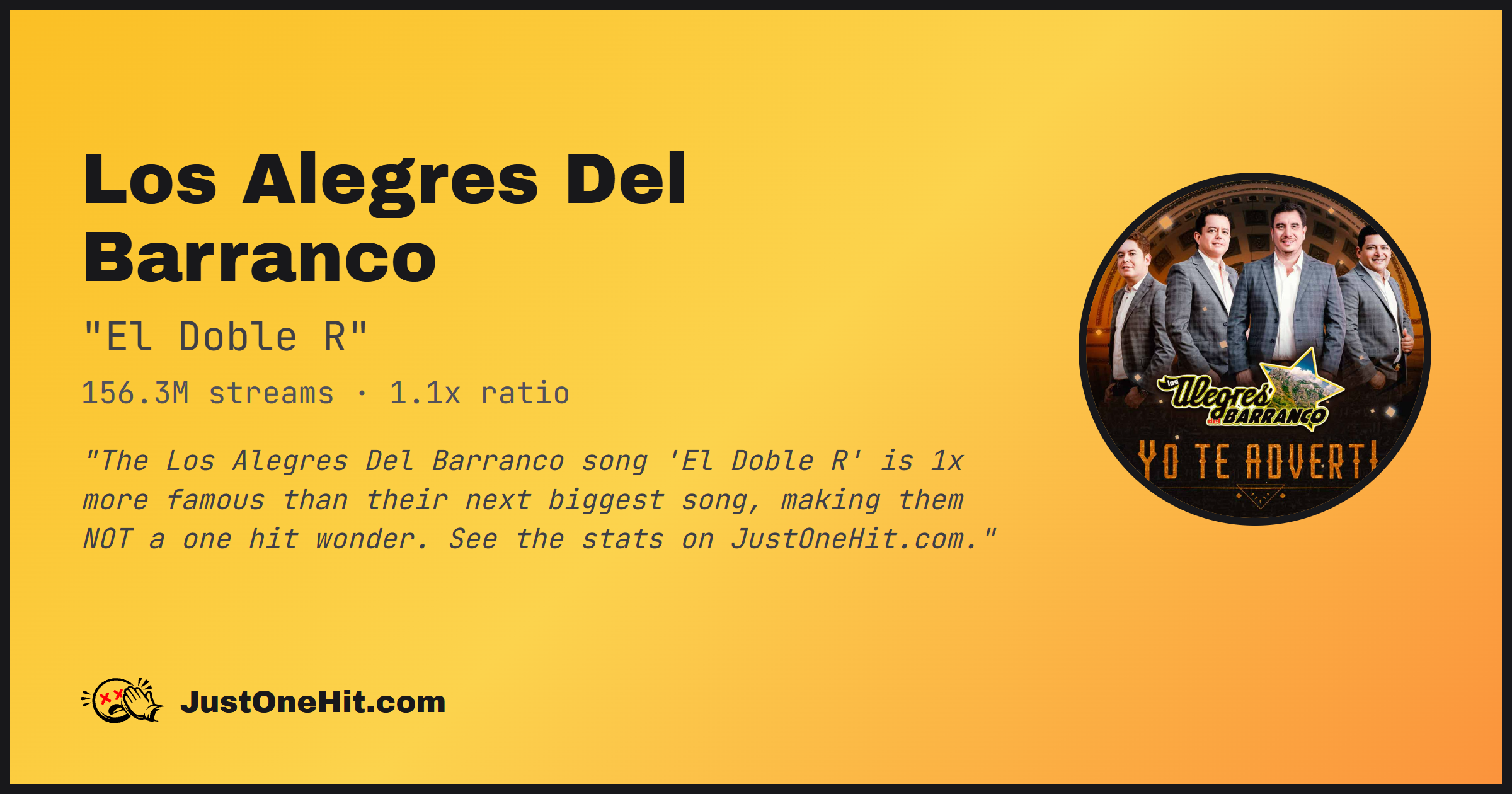 "The Los Alegres Del Barranco song 'El Doble R' is 1x more famous than their next biggest song, making them NOT a one hit wonder. See the stats on JustOneHit.com."
