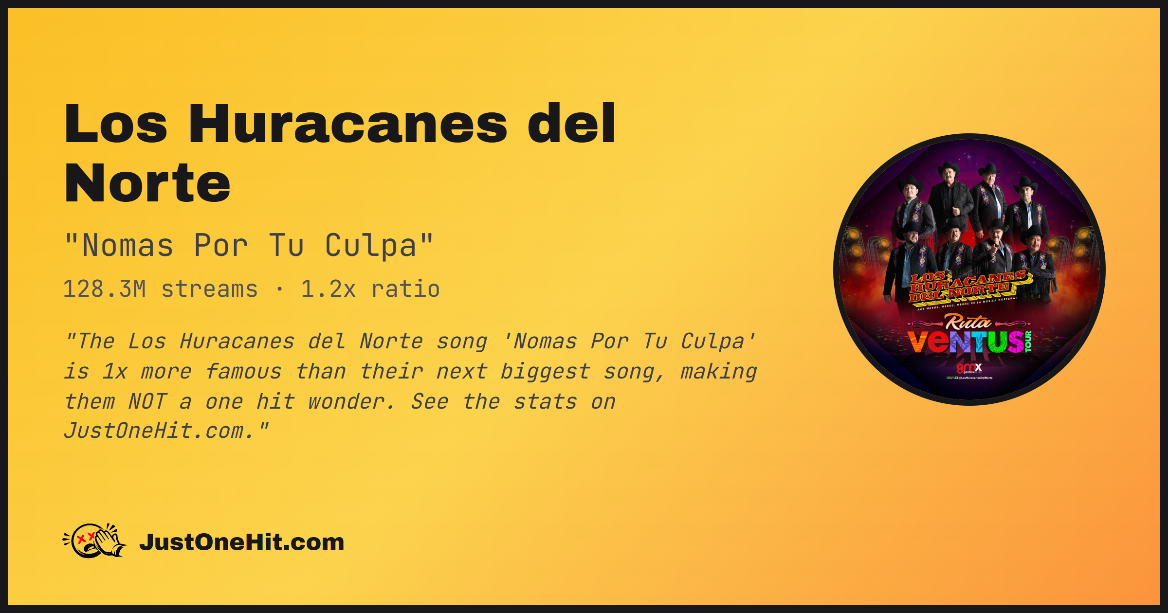 "The Los Huracanes del Norte song 'Nomas Por Tu Culpa' is 1x more famous than their next biggest song, making them NOT a one hit wonder. See the stats on JustOneHit.com."