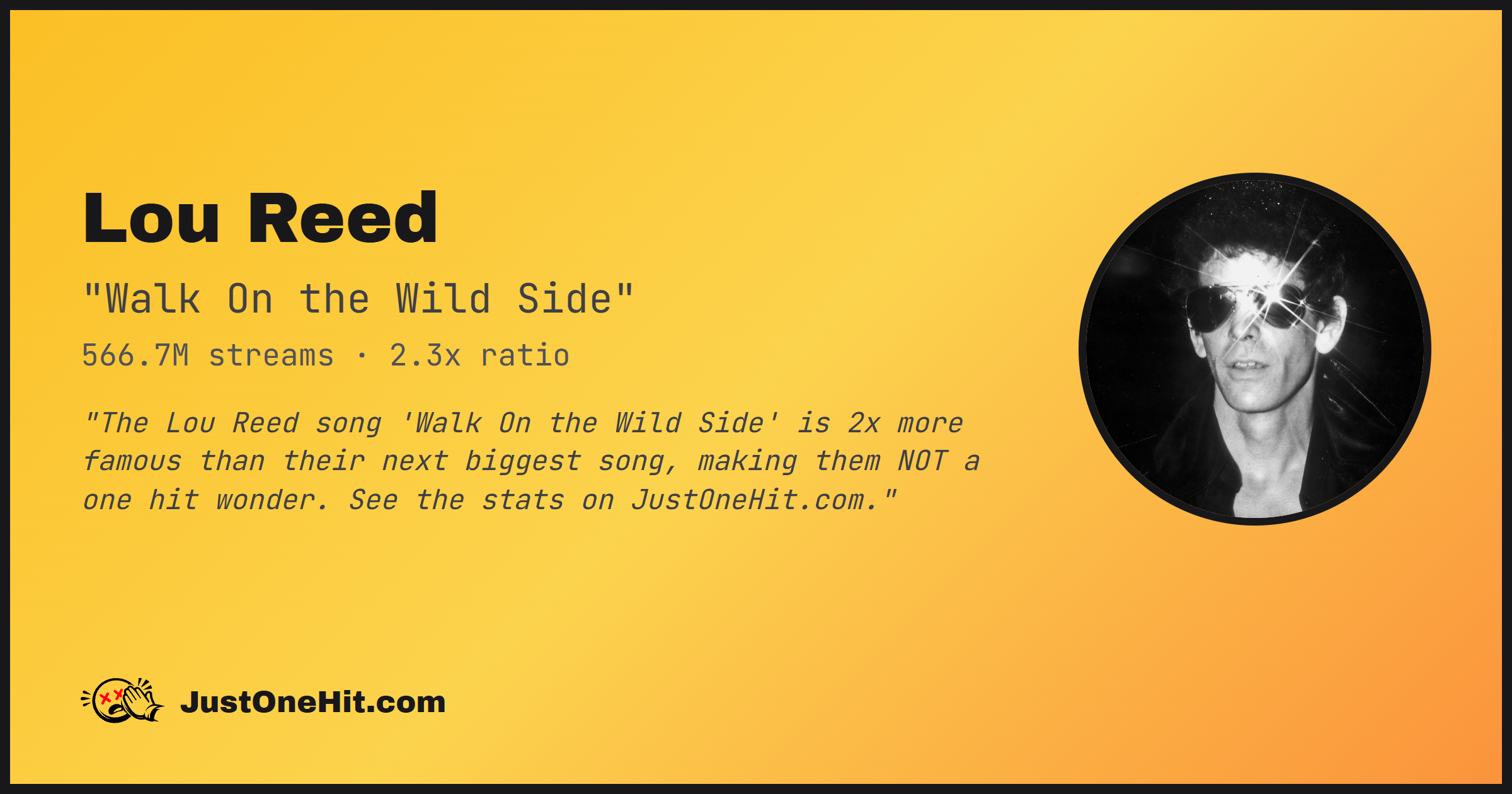 "The Lou Reed song 'Walk On the Wild Side' is 2x more famous than their next biggest song, making them NOT a one hit wonder. See the stats on JustOneHit.com."
