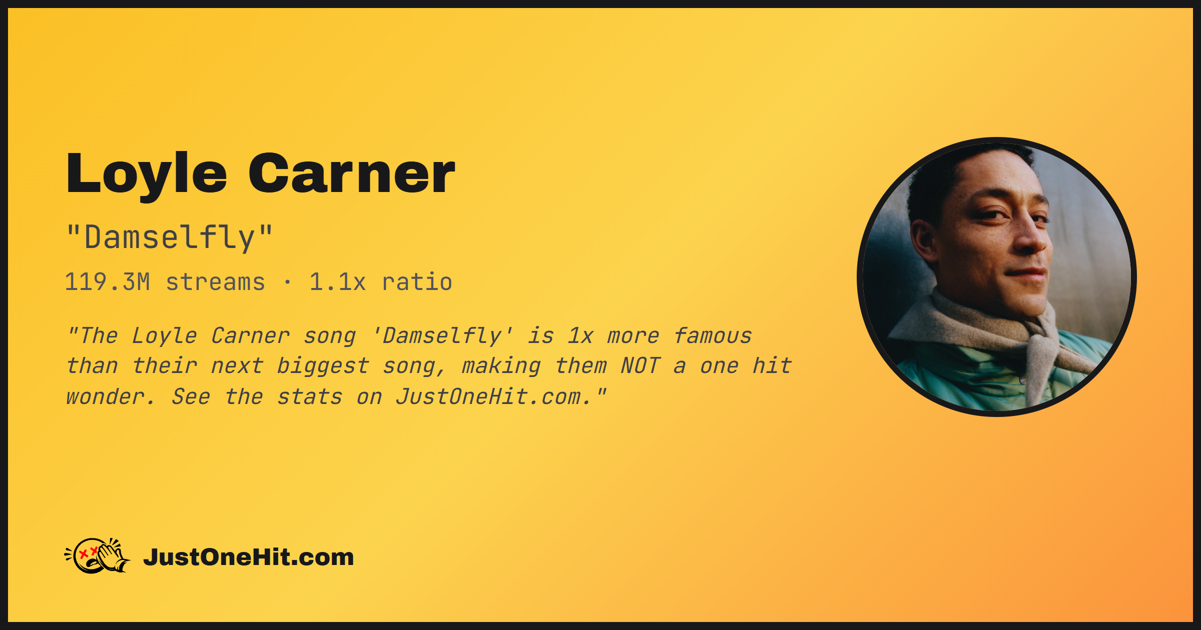 "The Loyle Carner song 'Damselfly' is 1x more famous than their next biggest song, making them NOT a one hit wonder. See the stats on JustOneHit.com."