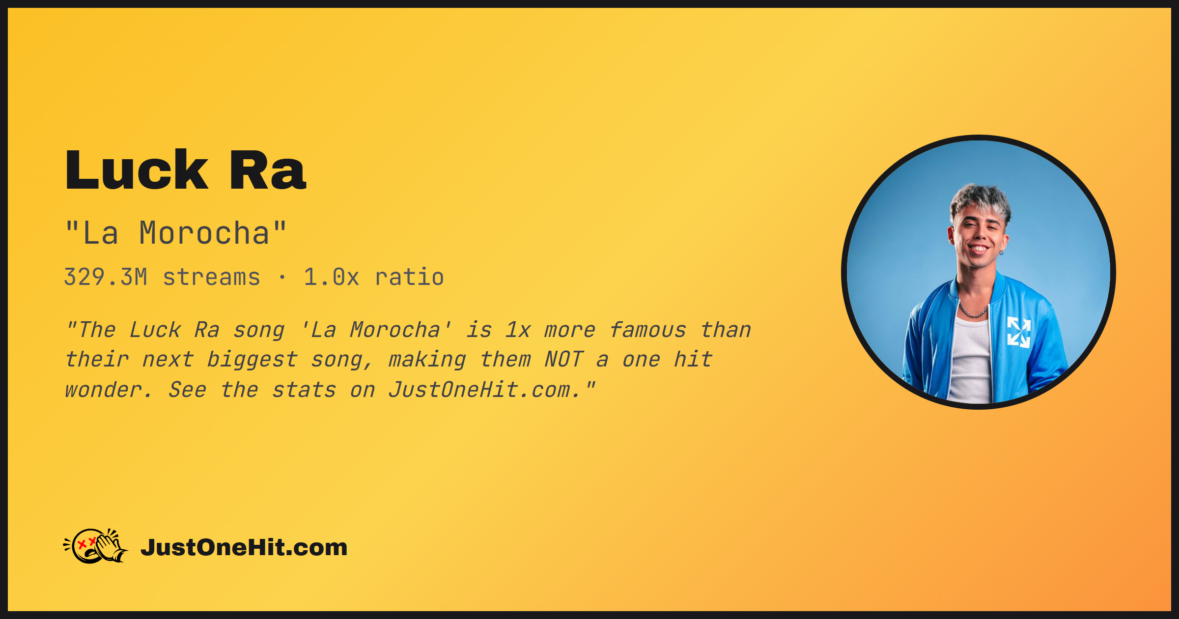 "The Luck Ra song 'La Morocha' is 1x more famous than their next biggest song, making them NOT a one hit wonder. See the stats on JustOneHit.com."