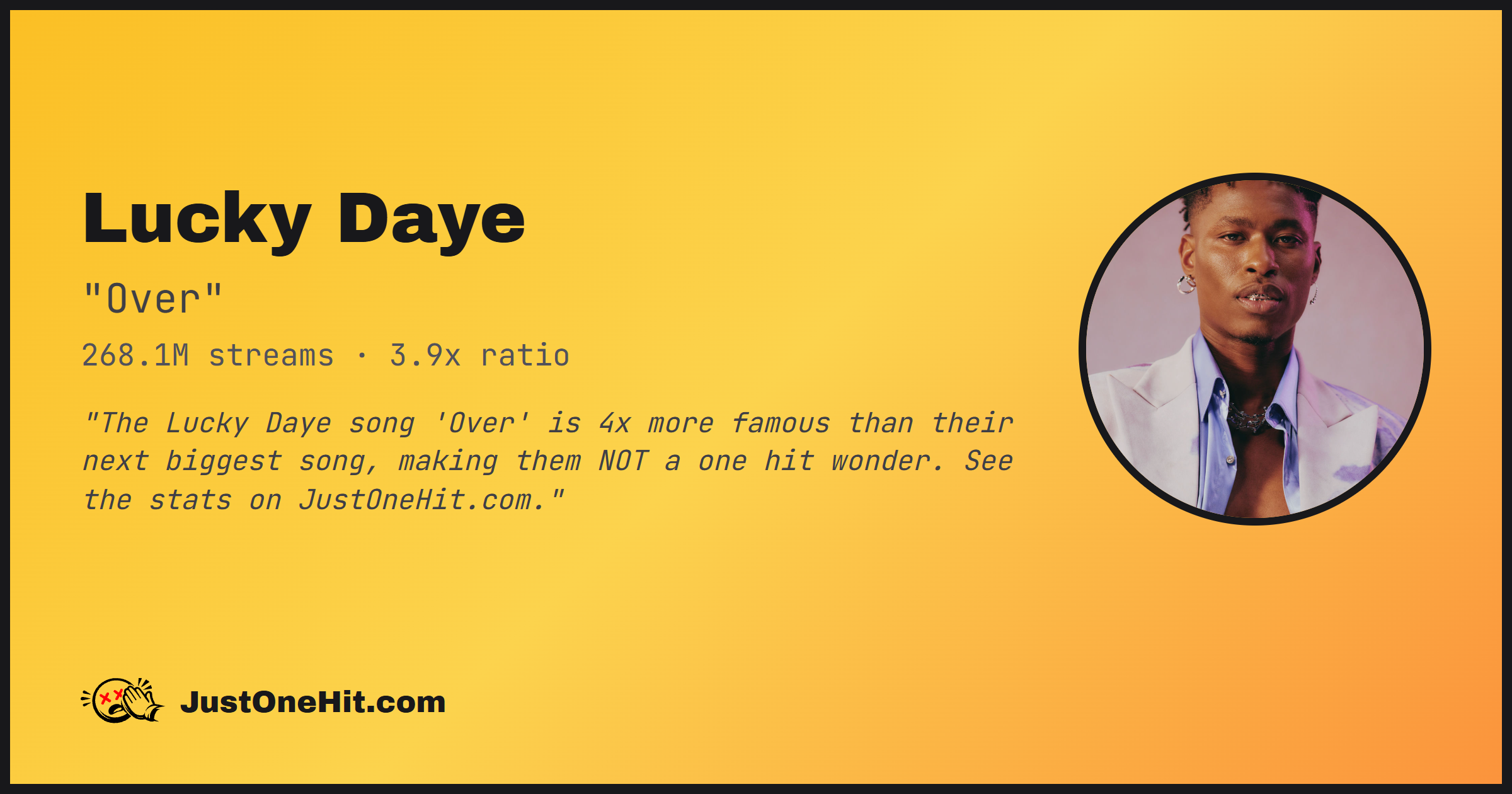 "The Lucky Daye song 'Over' is 4x more famous than their next biggest song, making them NOT a one hit wonder. See the stats on JustOneHit.com."