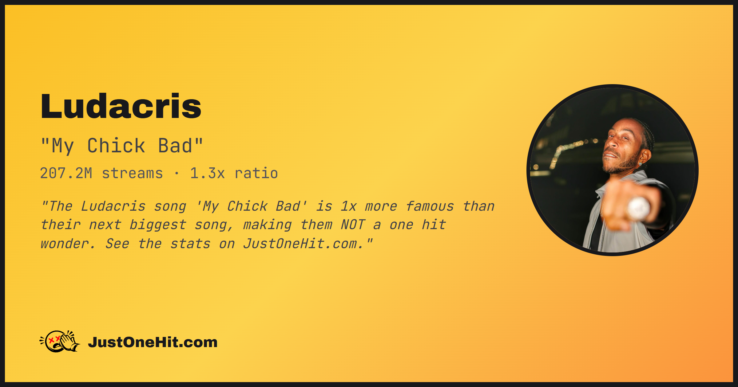 "The Ludacris song 'My Chick Bad' is 1x more famous than their next biggest song, making them NOT a one hit wonder. See the stats on JustOneHit.com."