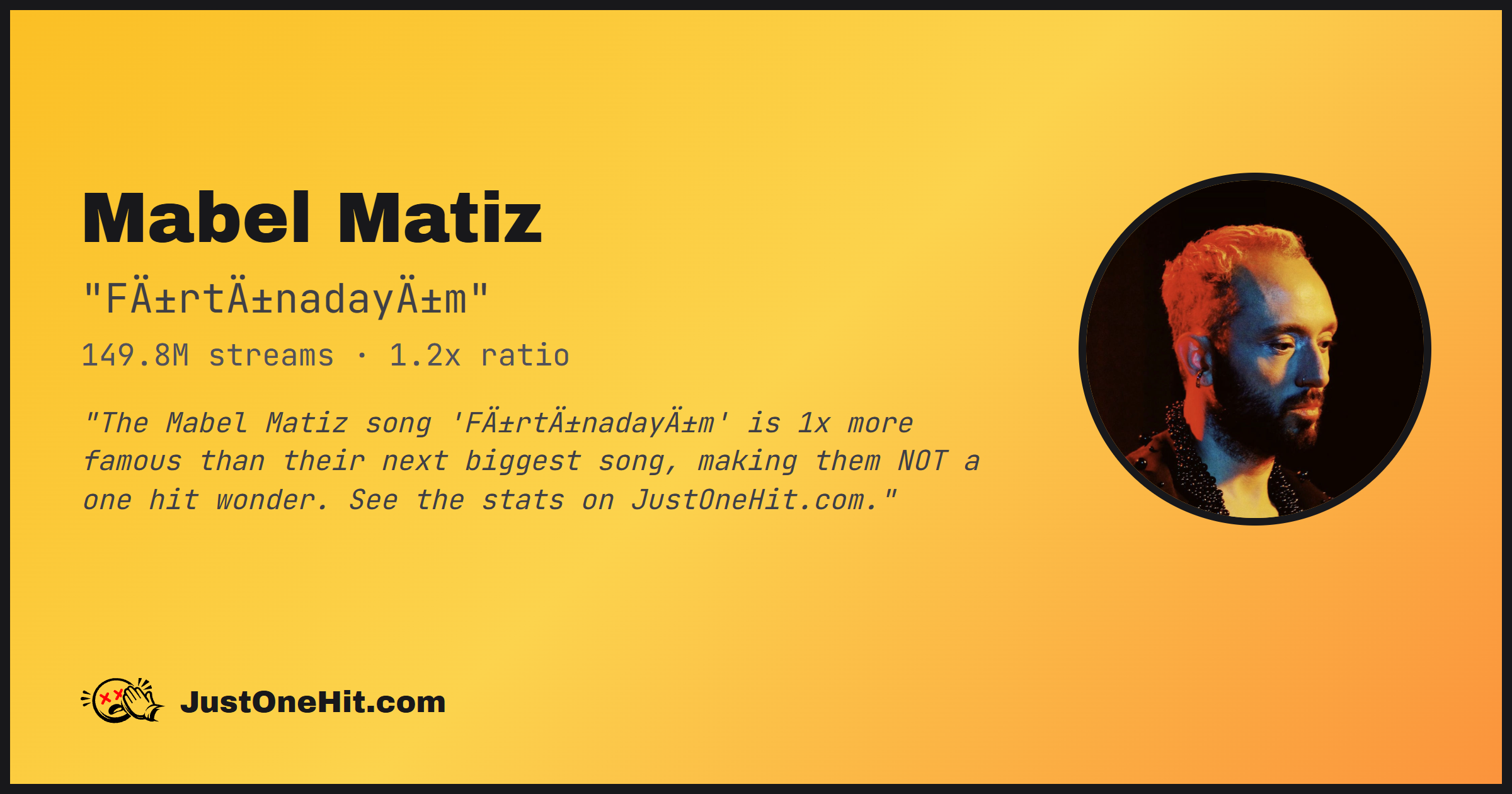 "The Mabel Matiz song 'Fırtınadayım' is 1x more famous than their next biggest song, making them NOT a one hit wonder. See the stats on JustOneHit.com."