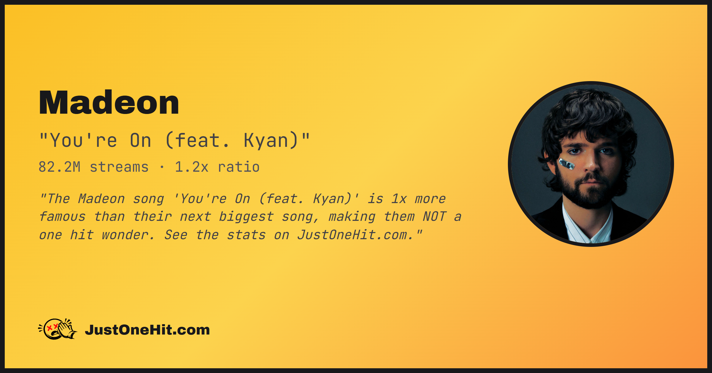 "The Madeon song 'You're On (feat. Kyan)' is 1x more famous than their next biggest song, making them NOT a one hit wonder. See the stats on JustOneHit.com."
