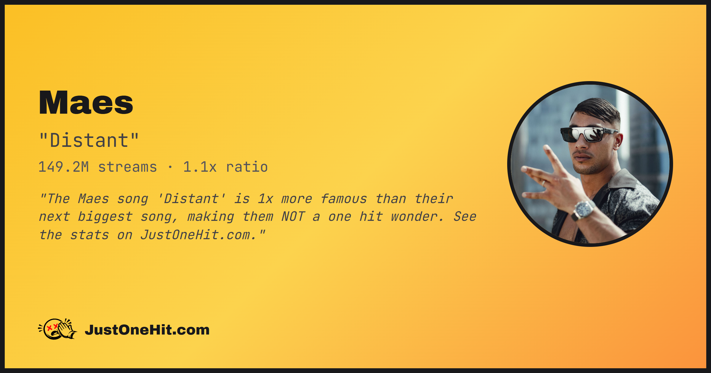 "The Maes song 'Distant' is 1x more famous than their next biggest song, making them NOT a one hit wonder. See the stats on JustOneHit.com."