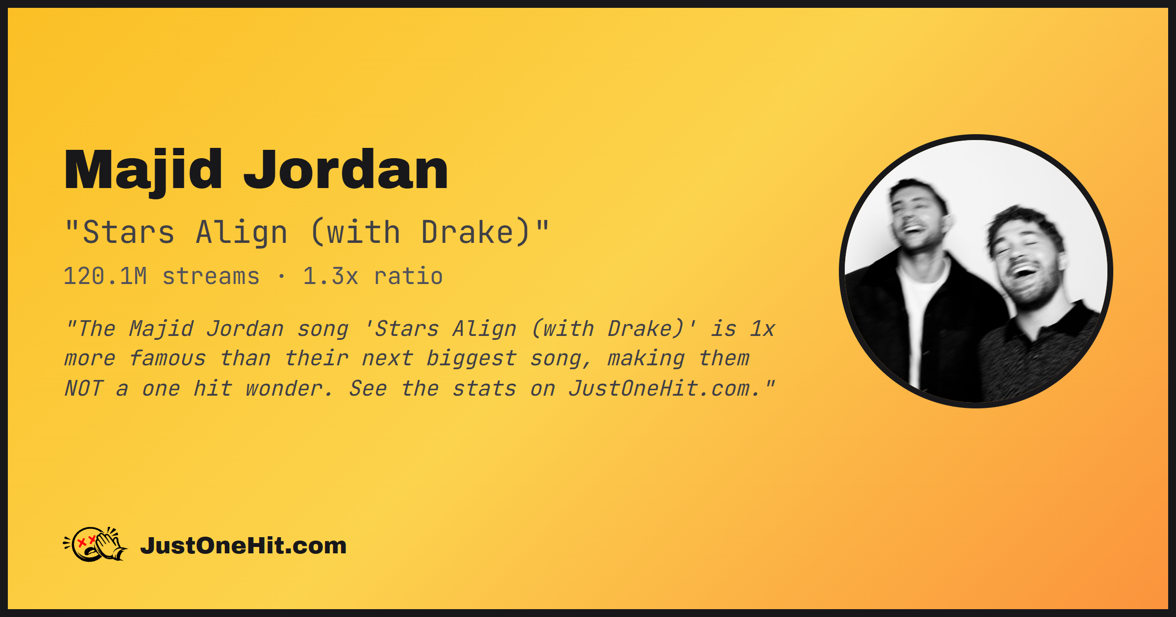 "The Majid Jordan song 'Stars Align (with Drake)' is 1x more famous than their next biggest song, making them NOT a one hit wonder. See the stats on JustOneHit.com."