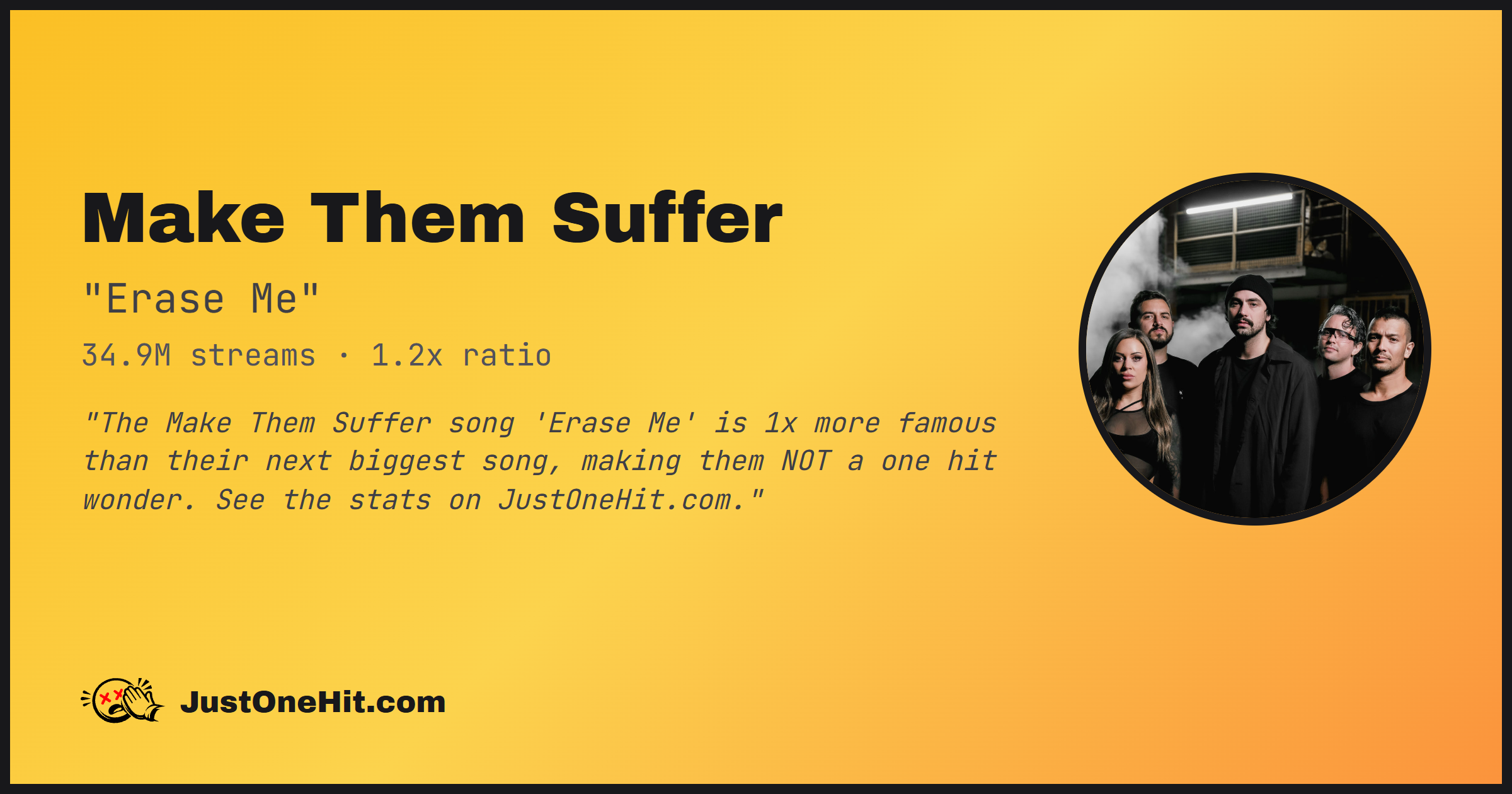 "The Make Them Suffer song 'Erase Me' is 1x more famous than their next biggest song, making them NOT a one hit wonder. See the stats on JustOneHit.com."