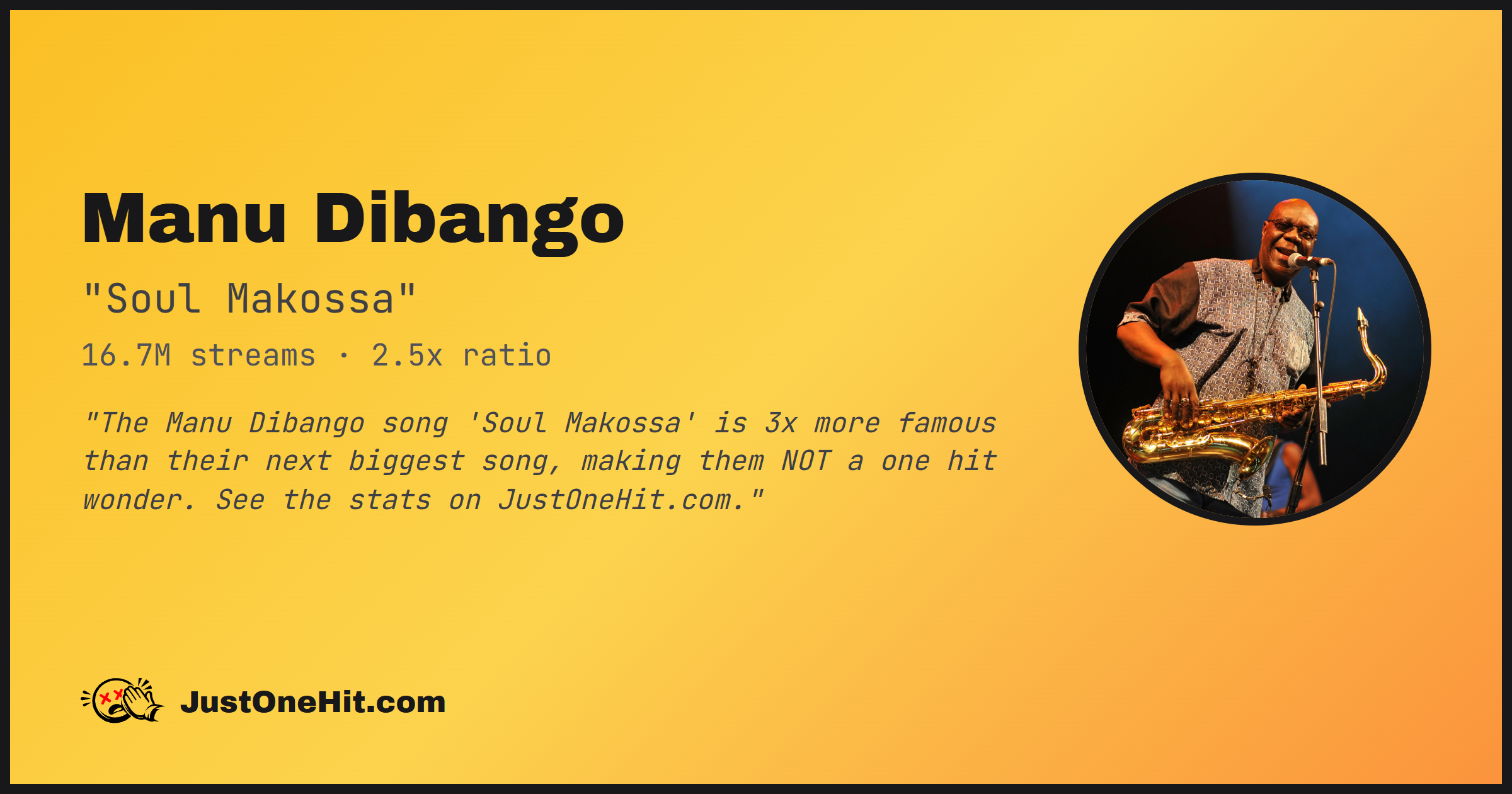 "The Manu Dibango song 'Soul Makossa' is 3x more famous than their next biggest song, making them NOT a one hit wonder. See the stats on JustOneHit.com."