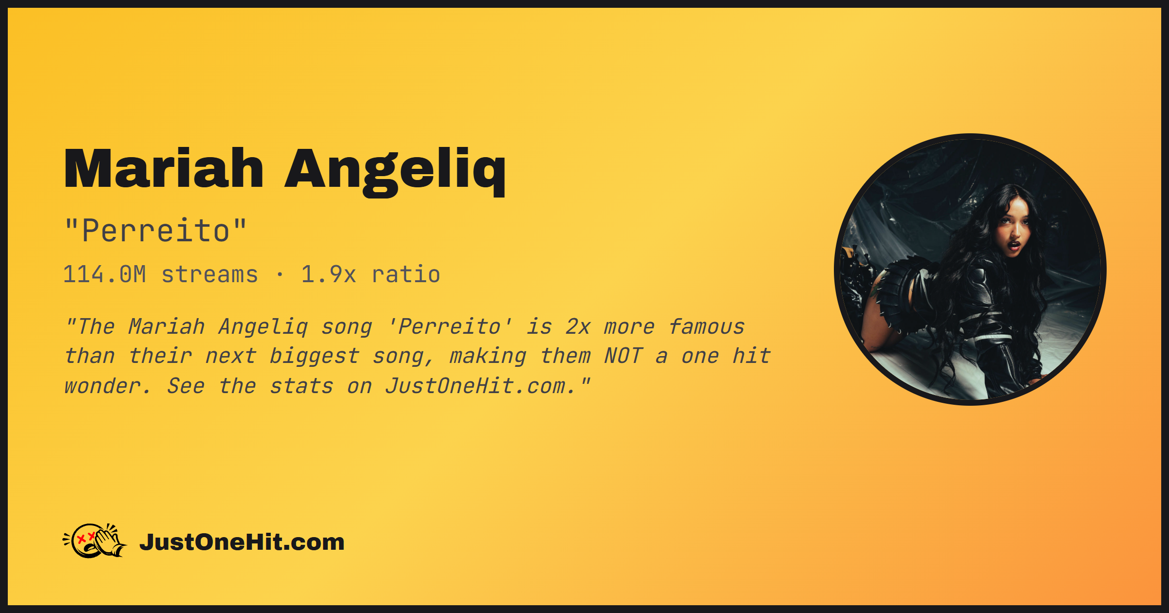 "The Mariah Angeliq song 'Perreito' is 2x more famous than their next biggest song, making them NOT a one hit wonder. See the stats on JustOneHit.com."