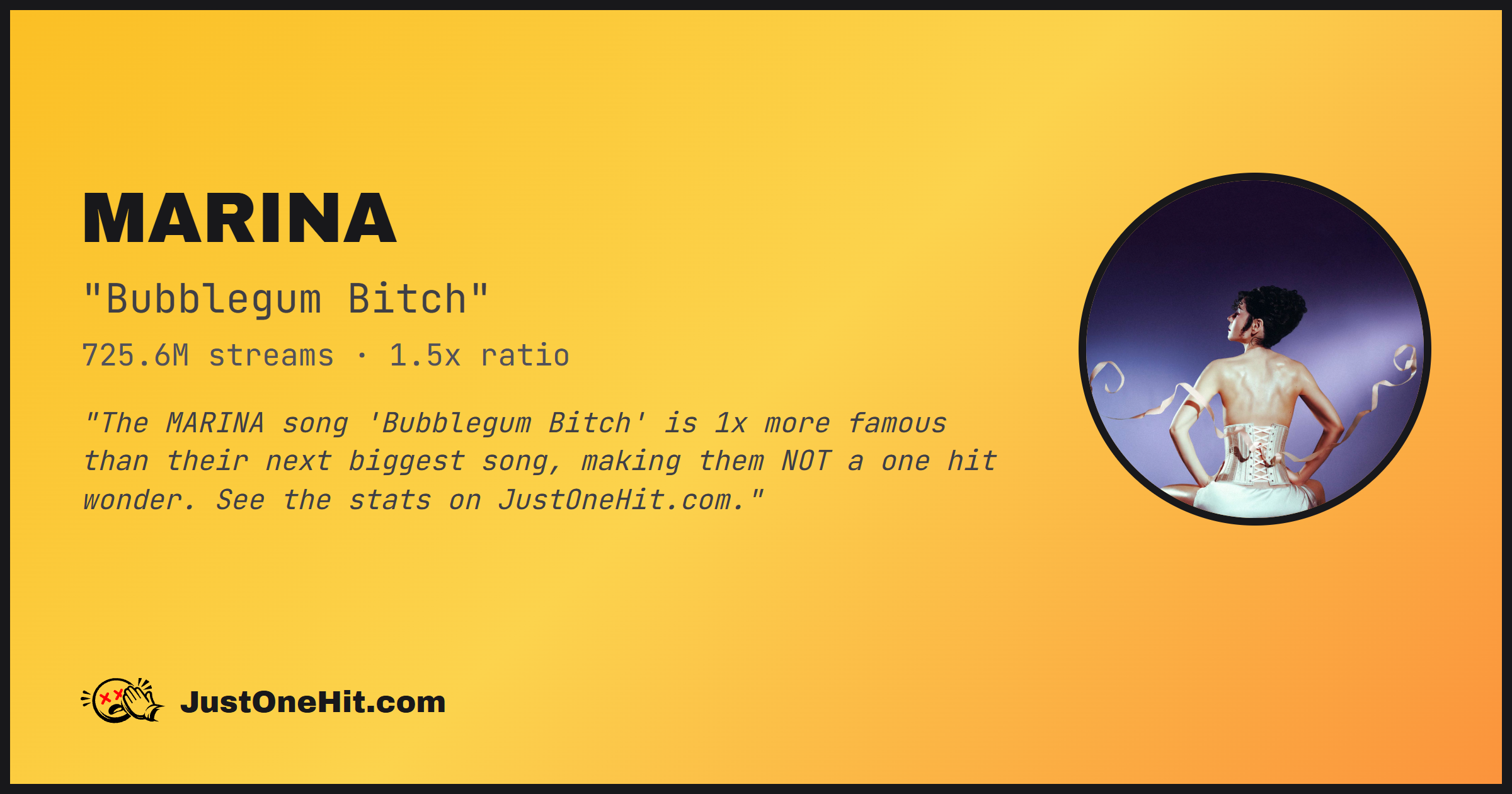 "The MARINA song 'Bubblegum Bitch' is 1x more famous than their next biggest song, making them NOT a one hit wonder. See the stats on JustOneHit.com."