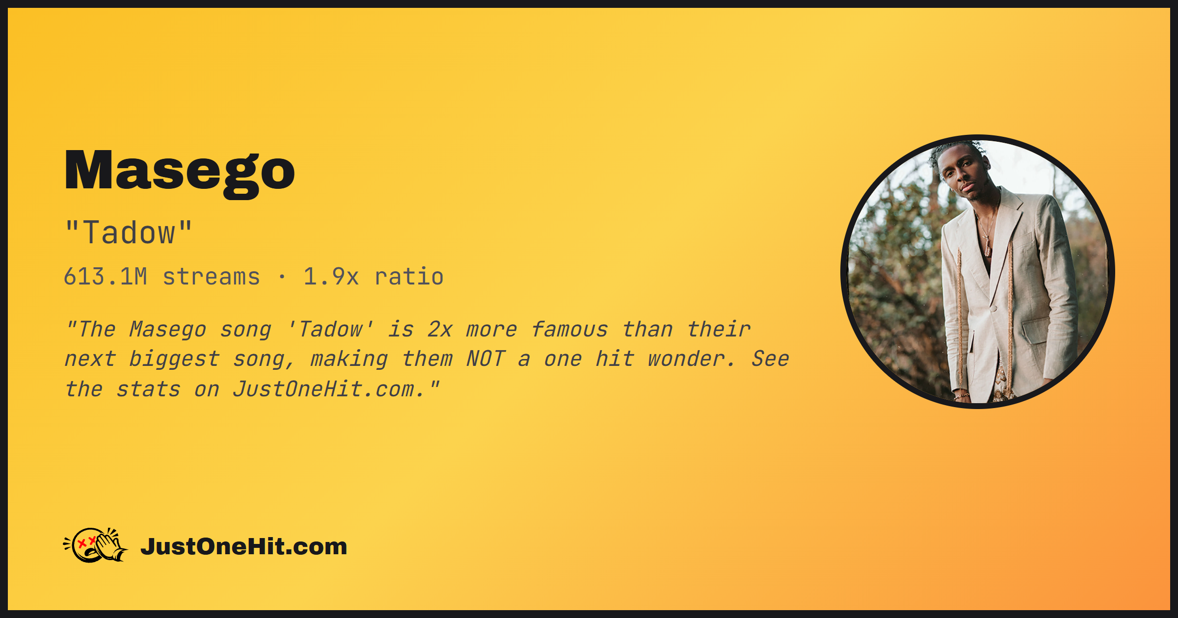 "The Masego song 'Tadow' is 2x more famous than their next biggest song, making them NOT a one hit wonder. See the stats on JustOneHit.com."