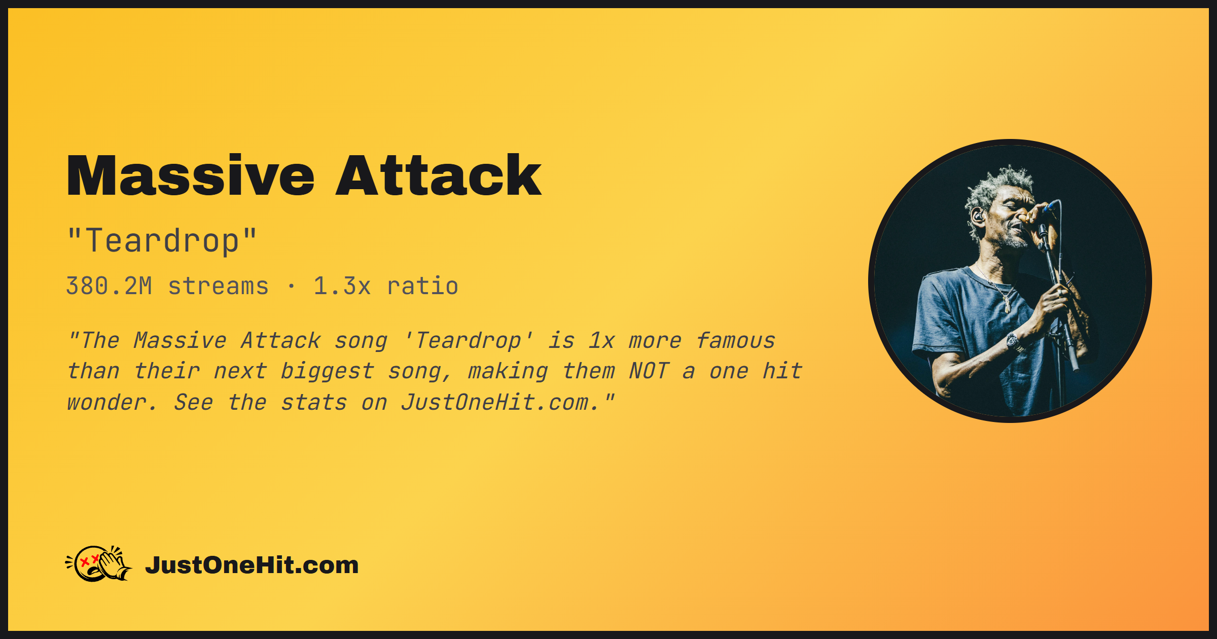"The Massive Attack song 'Teardrop' is 1x more famous than their next biggest song, making them NOT a one hit wonder. See the stats on JustOneHit.com."
