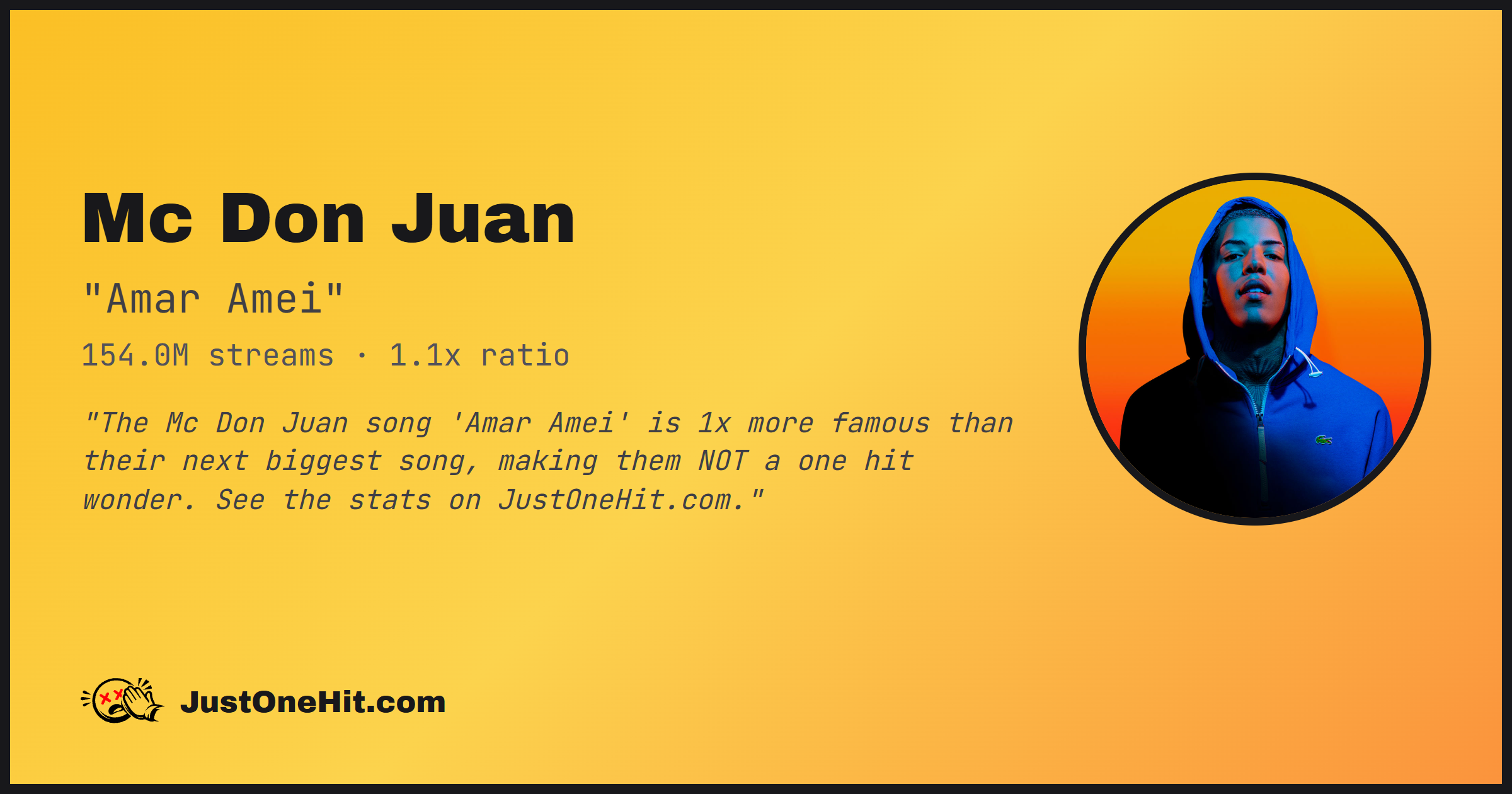 "The Mc Don Juan song 'Amar Amei' is 1x more famous than their next biggest song, making them NOT a one hit wonder. See the stats on JustOneHit.com."