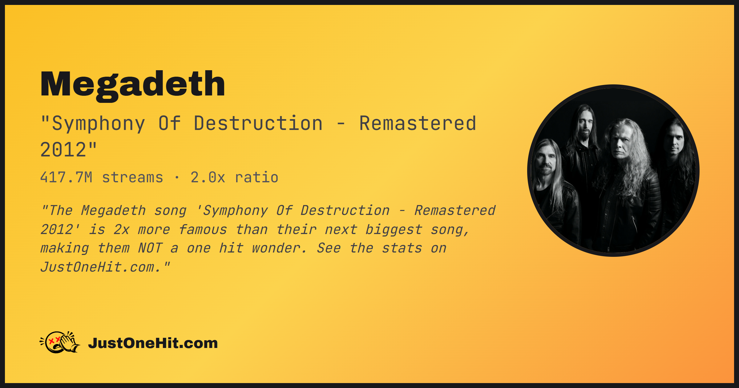 "The Megadeth song 'Symphony Of Destruction - Remastered 2012' is 2x more famous than their next biggest song, making them NOT a one hit wonder. See the stats on JustOneHit.com."
