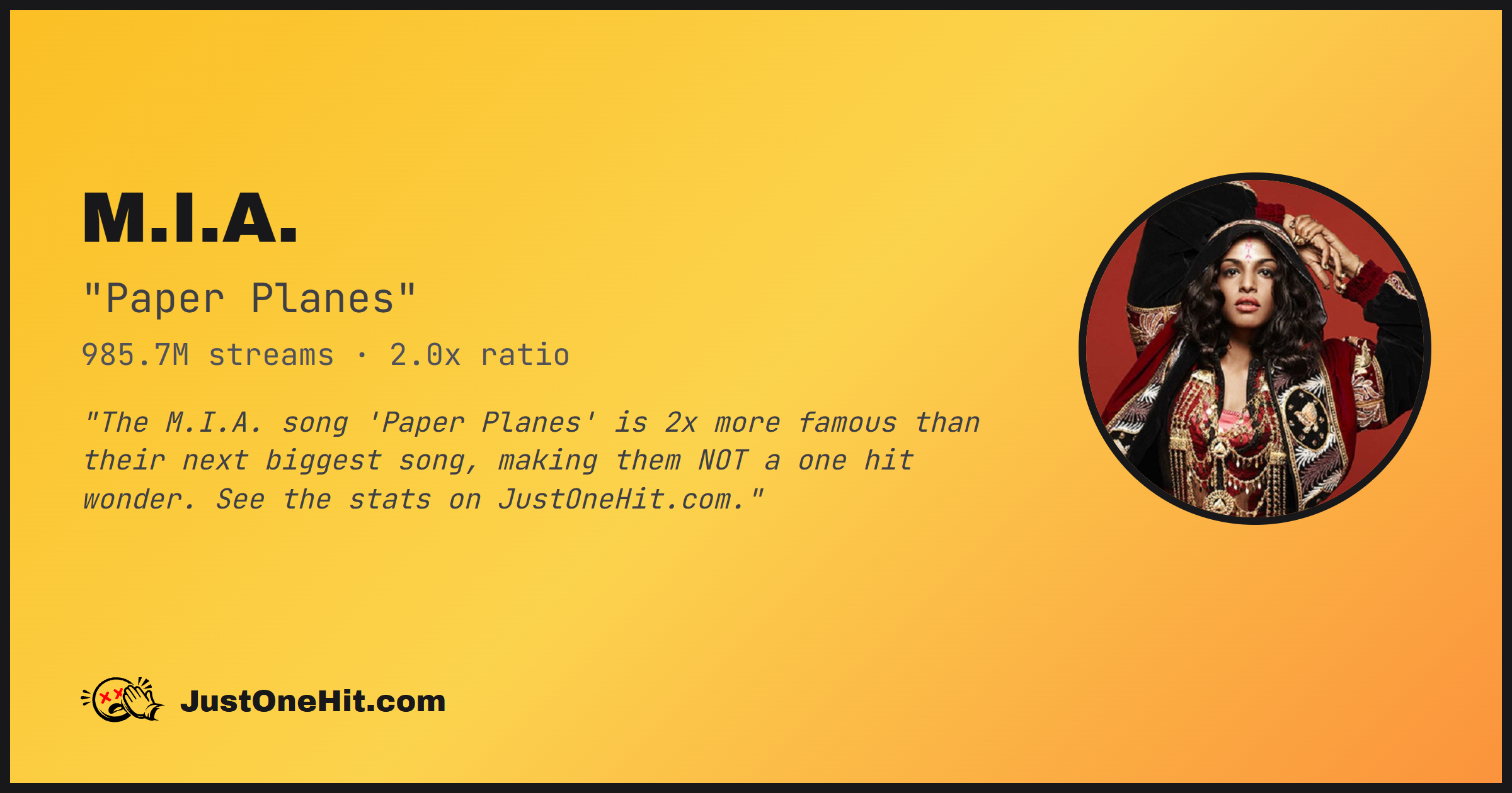 "The M.I.A. song 'Paper Planes' is 2x more famous than their next biggest song, making them NOT a one hit wonder. See the stats on JustOneHit.com."