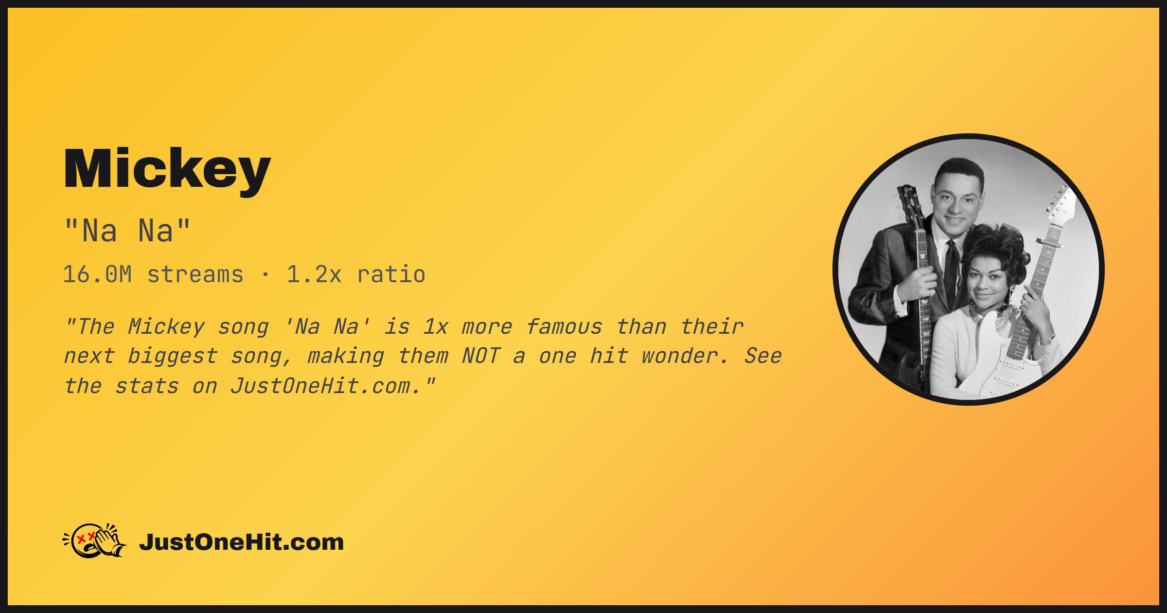 "The Mickey song 'Na Na' is 1x more famous than their next biggest song, making them NOT a one hit wonder. See the stats on JustOneHit.com."