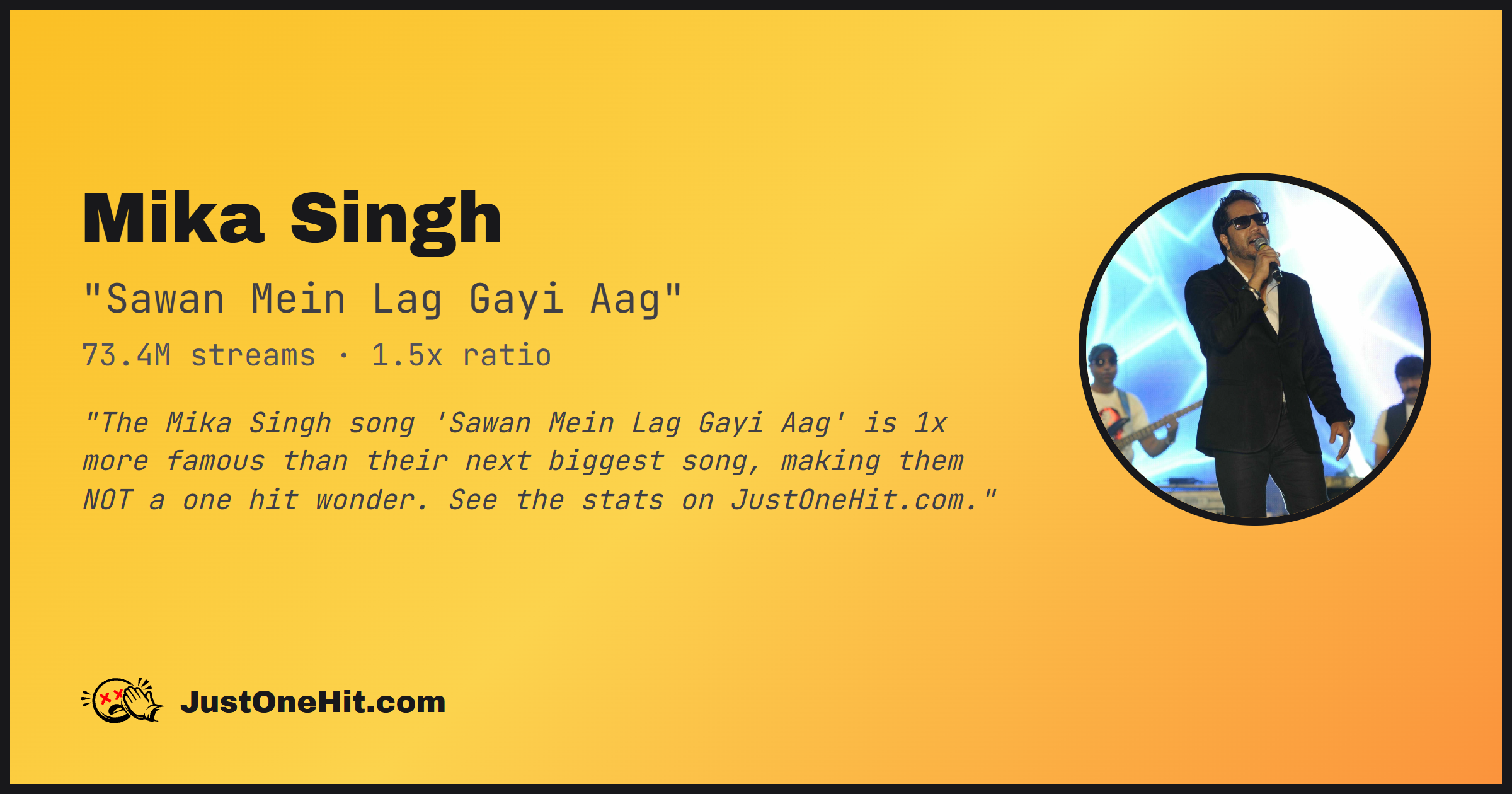 "The Mika Singh song 'Sawan Mein Lag Gayi Aag' is 1x more famous than their next biggest song, making them NOT a one hit wonder. See the stats on JustOneHit.com."