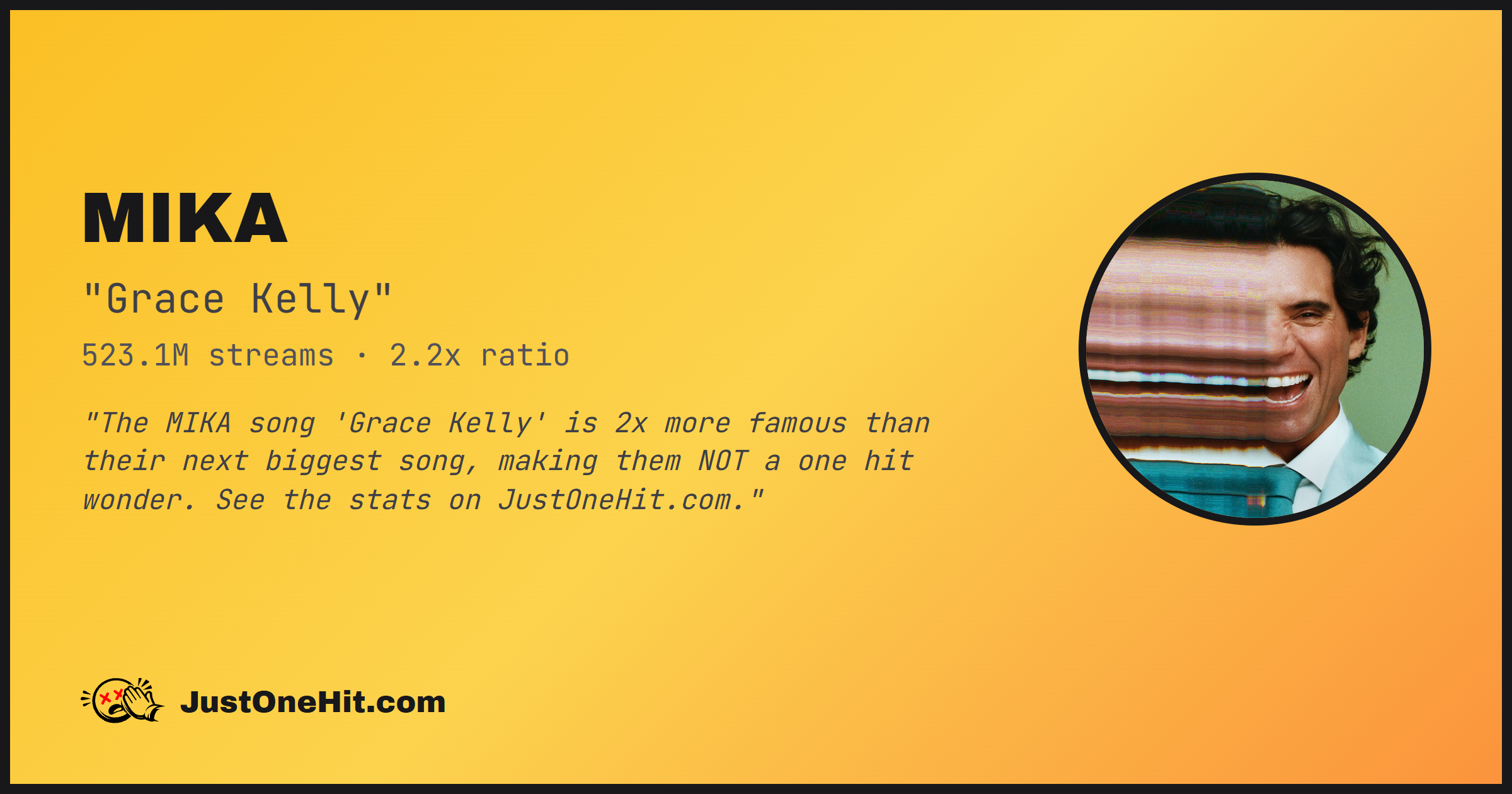"The MIKA song 'Grace Kelly' is 2x more famous than their next biggest song, making them NOT a one hit wonder. See the stats on JustOneHit.com."