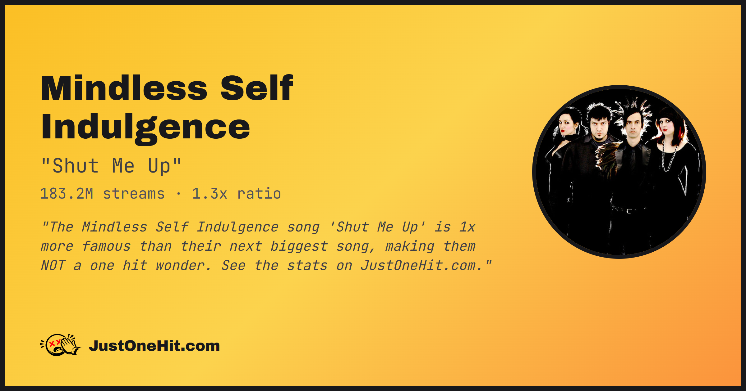 "The Mindless Self Indulgence song 'Shut Me Up' is 1x more famous than their next biggest song, making them NOT a one hit wonder. See the stats on JustOneHit.com."