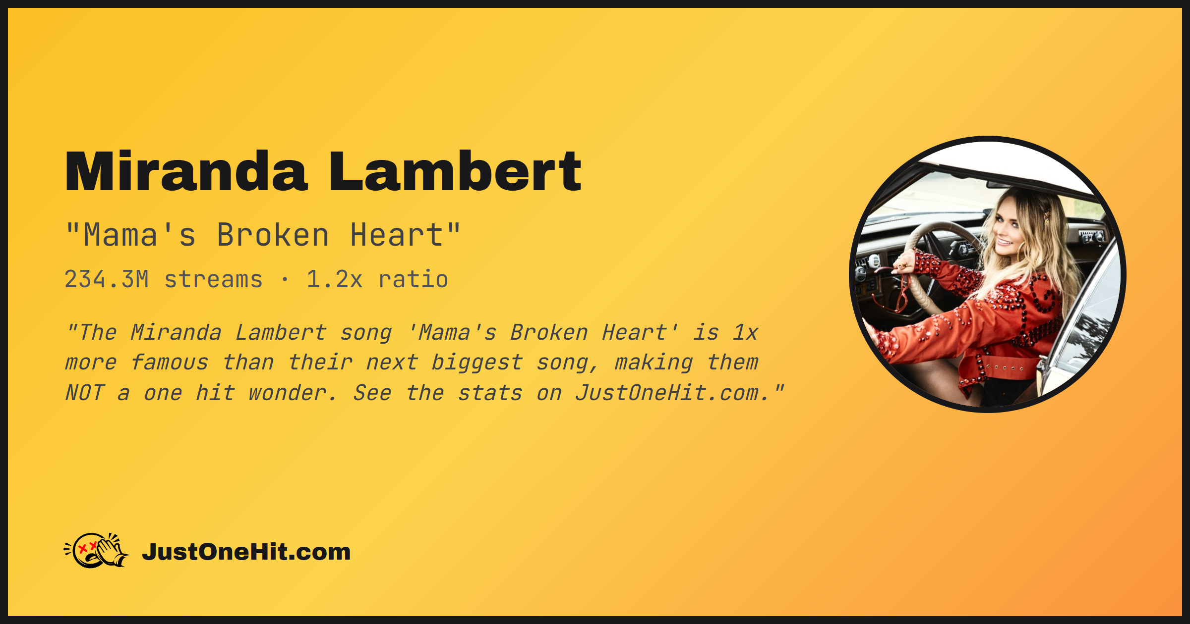 "The Miranda Lambert song 'Mama's Broken Heart' is 1x more famous than their next biggest song, making them NOT a one hit wonder. See the stats on JustOneHit.com."