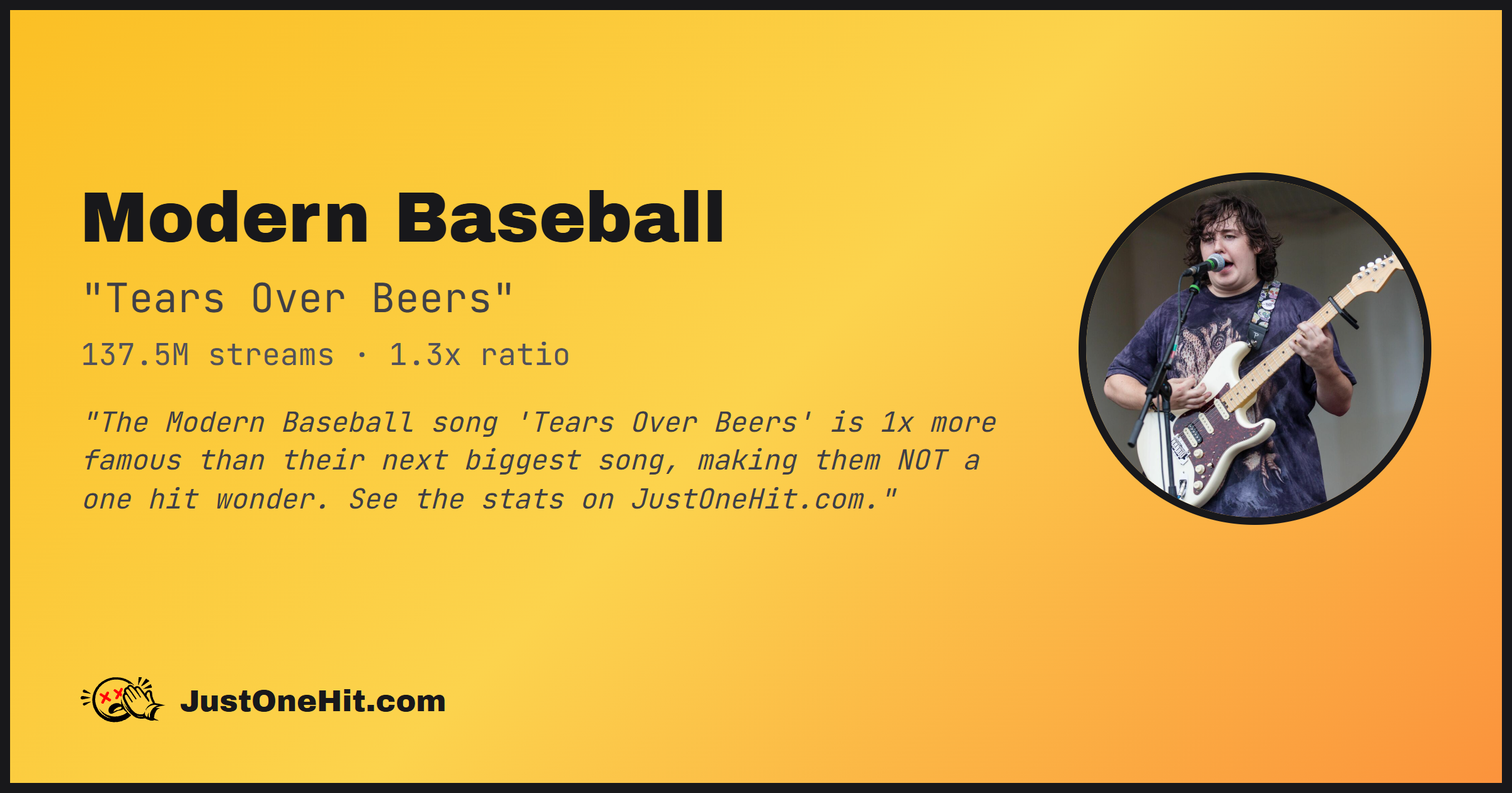 "The Modern Baseball song 'Tears Over Beers' is 1x more famous than their next biggest song, making them NOT a one hit wonder. See the stats on JustOneHit.com."