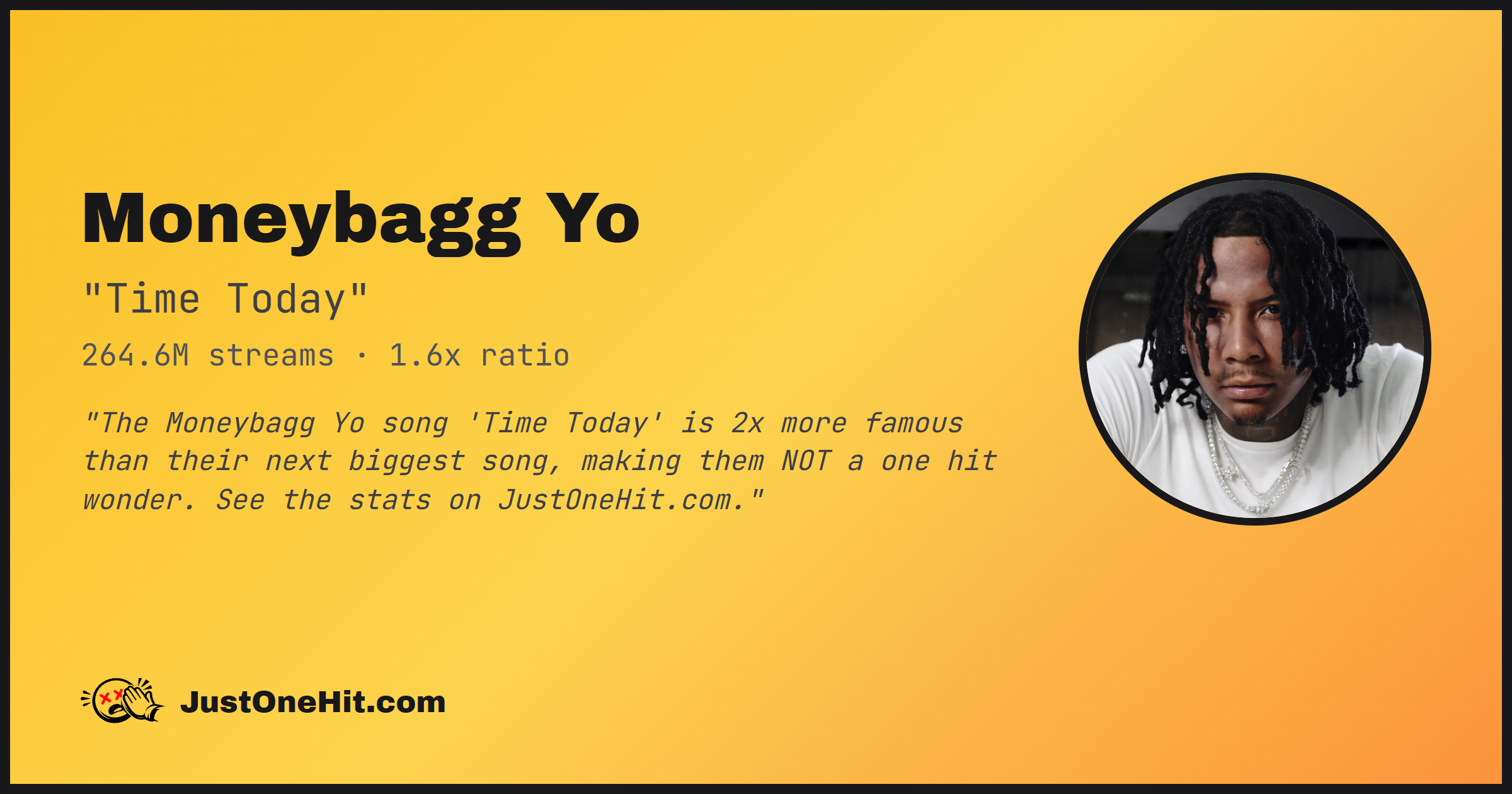"The Moneybagg Yo song 'Time Today' is 2x more famous than their next biggest song, making them NOT a one hit wonder. See the stats on JustOneHit.com."